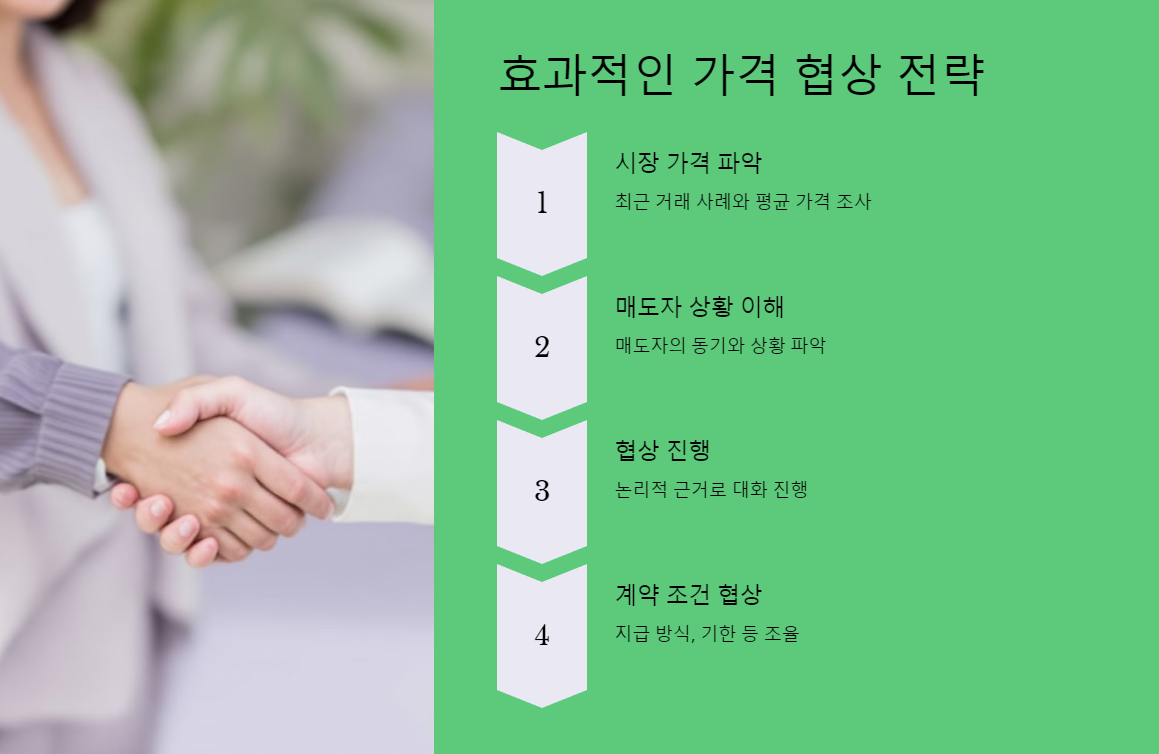 마지막으로, 계약 조건에 대한 협상도 중요해요. 단순히 가격뿐만 아니라, 대금 지급 방식, 중도금 지급 기한, 세금 부담 등 다양한 조건을 조율할 수 있어요. 이 과정에서 전문가(예: 부동산 중개인, 법무사)와 상담하며 진행하는 것도 도움이 된답니다.