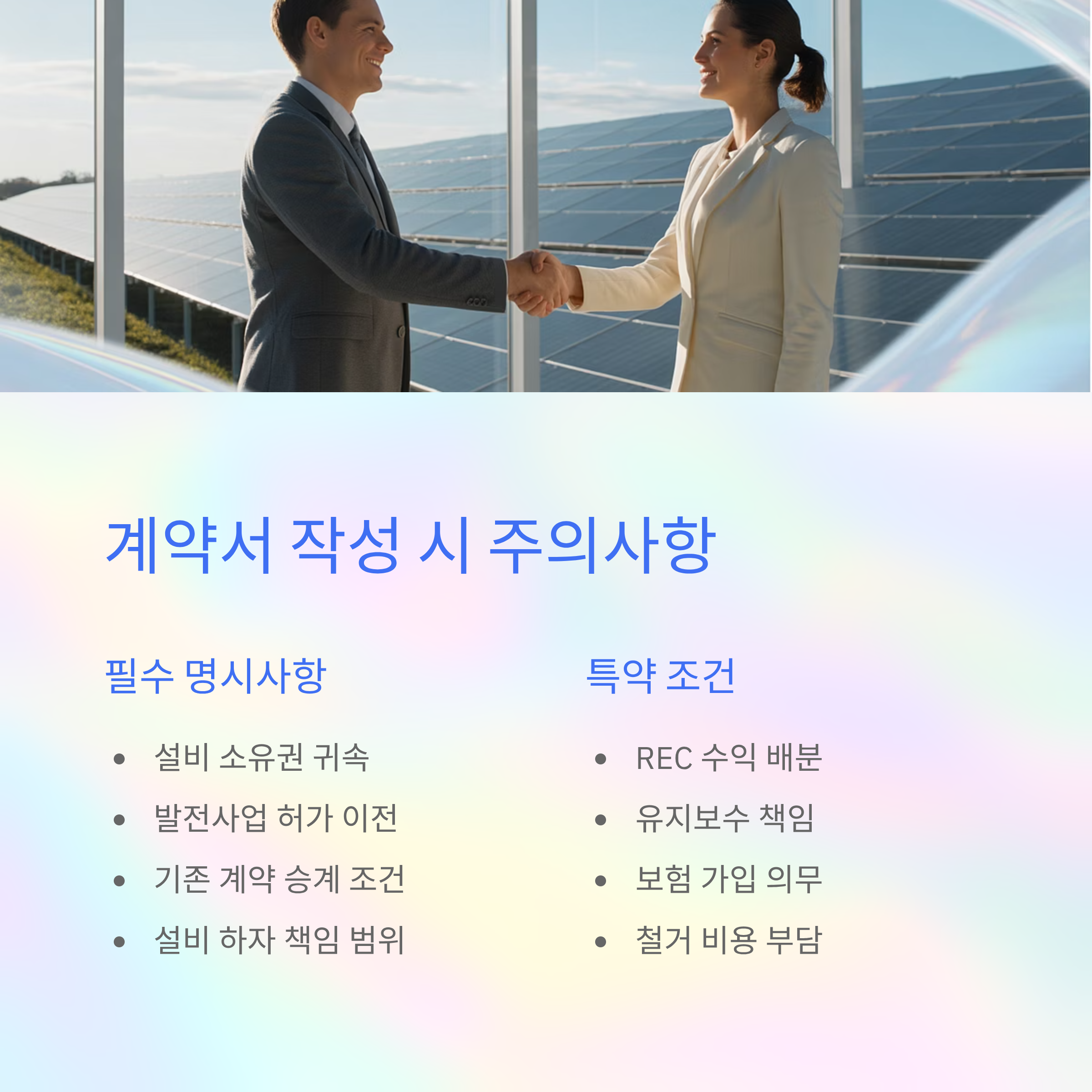 계약 단계에서 '태양광 설비와 관련된 권리 일체'가 매수자에게 이전된다는 내용을 포함시키면 훨씬 안전하고 깔끔한 거래가 가능해요. 꼼꼼한 계약이 곧 분쟁 예방이에요! 💡