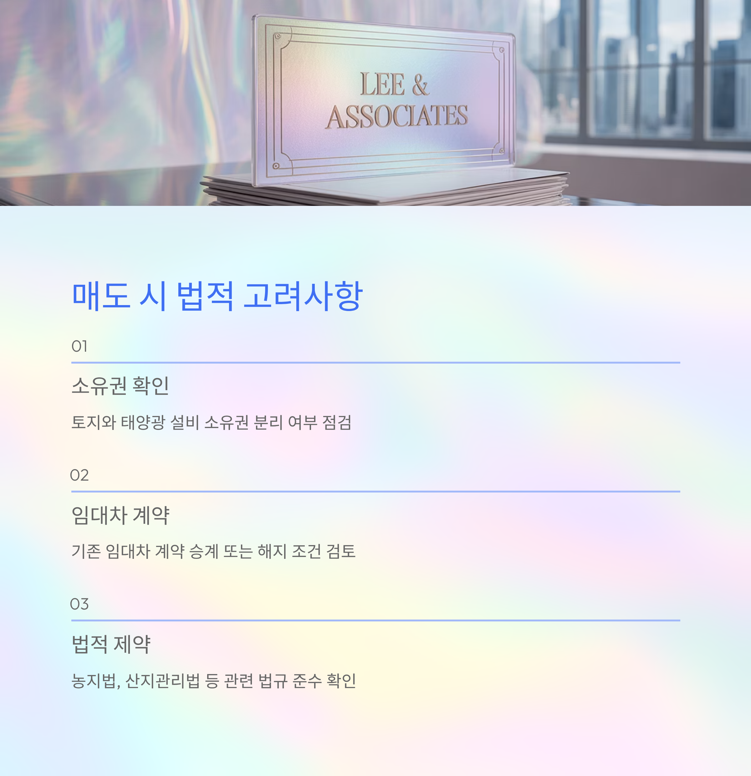 토지만 매매한다면 등기만 넘기면 끝나지만, 태양광 설비는 자산으로 등록되기 때문에 이전 절차가 복잡할 수 있어요. 계약서에 이런 모든 절차에 대한 세부 내용이 담겨 있어야 나중에 ‘이건 몰랐다’는 말을 듣지 않아요.