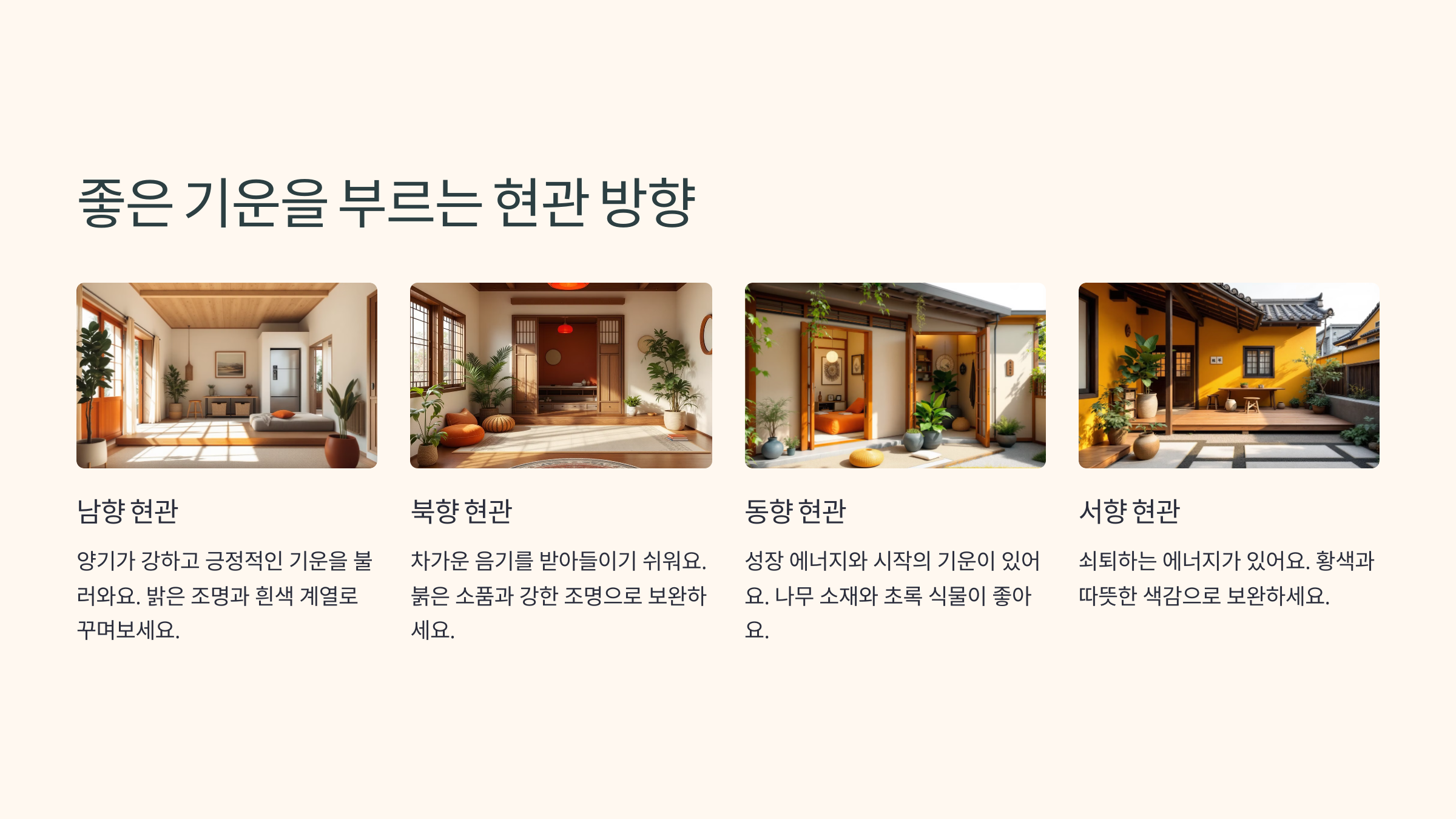 이제 현관 방향에 따라 어떤 기운이 흐르는지, 풍수에서는 어떻게 해석하는지 다음에서 살펴볼게요 🧭