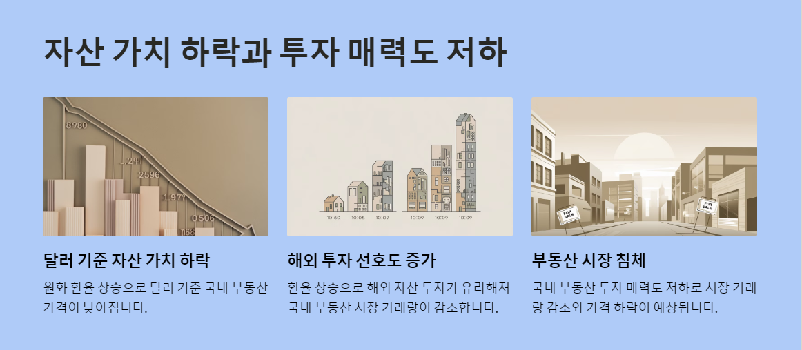 국내 부동산보다 환율 상승으로 유리해진 해외 자산으로 투자 흐름이 이동하게 됩니다. 이는 국내 부동산 시장의 거래량 감소와 가격 하락으로 이어질 수 있습니다.