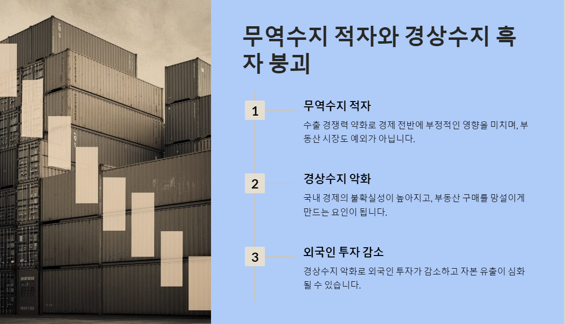 경상수지가 악화되면 국내 경제는 불확실성이 높아지고, 이는 부동산 구매를 망설이게 만드는 요인이 됩니다. 특히 외국인 투자 감소와 자본 유출이 심화될 수 있습니다.