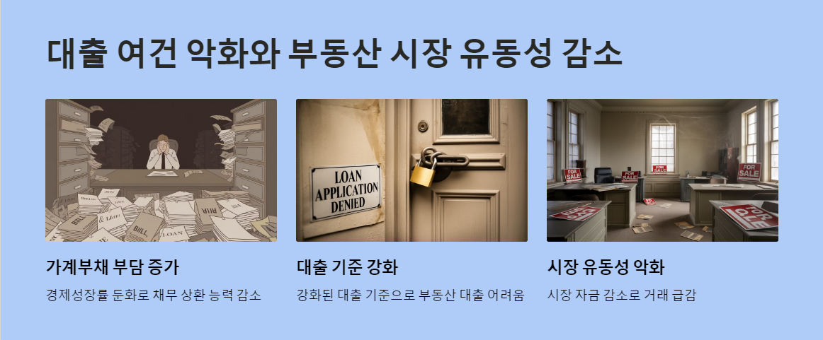 환율 상승으로 경제성장률이 둔화되면 가계의 채무 상환 능력이 감소합니다. 이는 금융권의 대출 기준을 강화시키며 부동산 대출 접근성을 낮춥니다. - 시장 유동성 악화