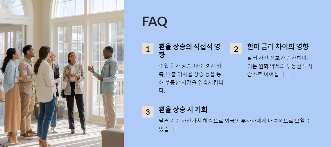 금리 차이로 인해 달러 자산 선호가 증가하며, 이는 원화 약세와 부동산 투자 감소로 이어집니다. - 환율 상승 시 국내 부동산 시장에 어떤 기회가 있을까요?