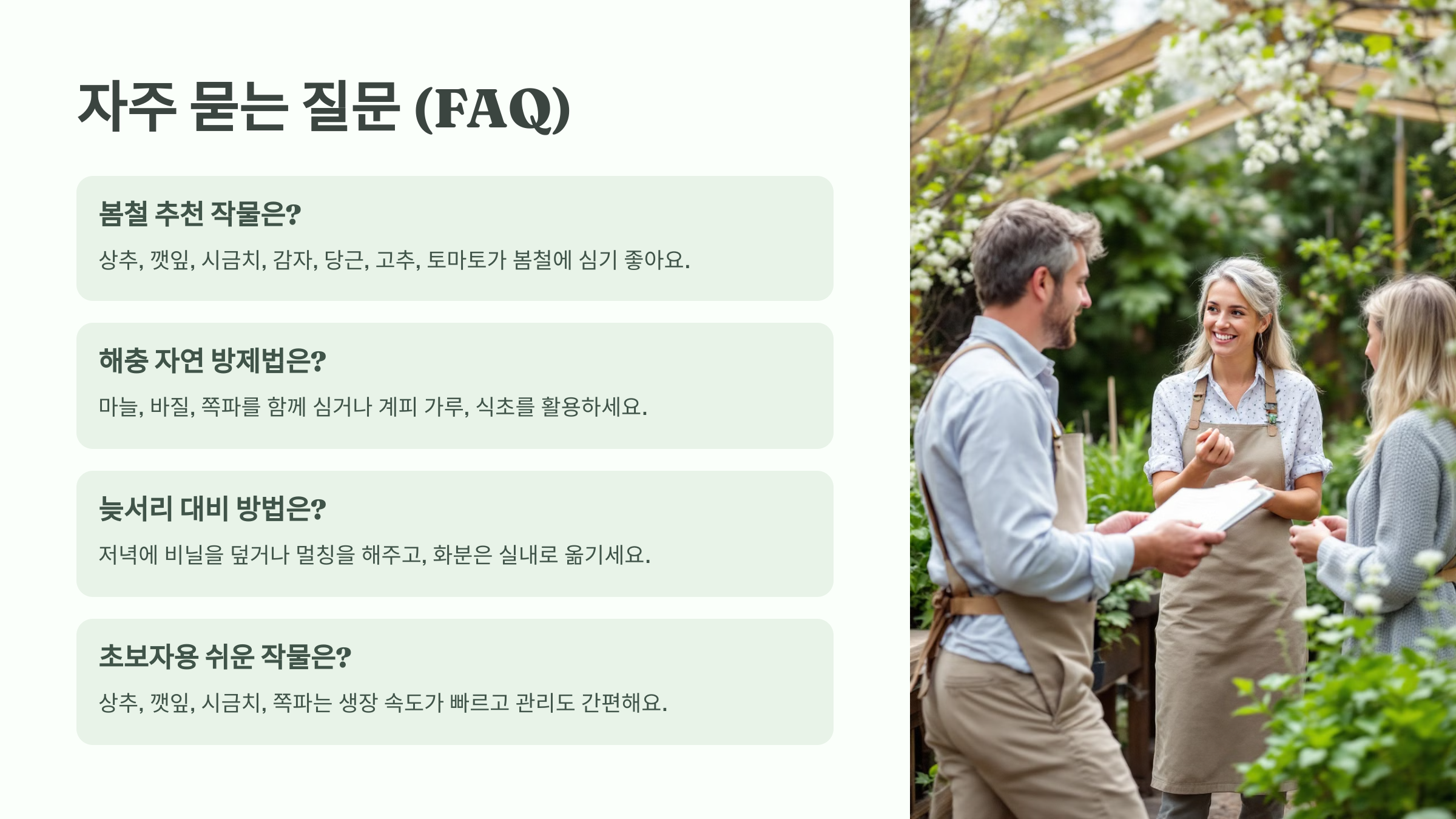 이 작물들은 비교적 관리가 쉽고, 텃밭 초보자도 키우기 좋아요! 기온이 완전히 안정되기 전까지는 냉해에 강한 작물부터 시작하는 것이 좋아요. ❄️