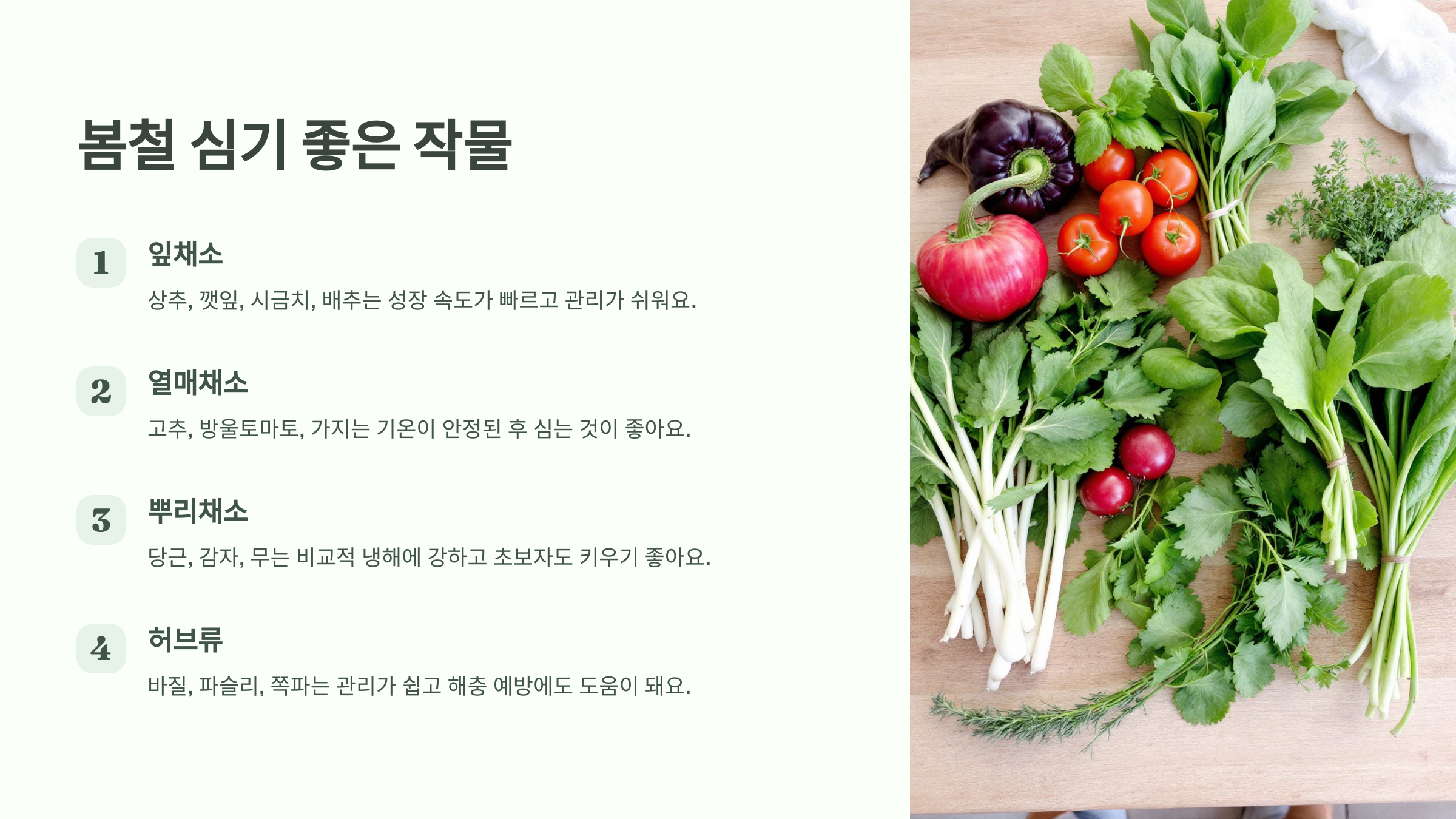 봄철에는 날씨가 점점 따뜻해지기 때문에 성장 속도가 빠른 작물을 심기에 좋아요. 기온 변화가 크더라도 잘 자라는 작물들을 선택하면 성공적인 수확이 가능해요.