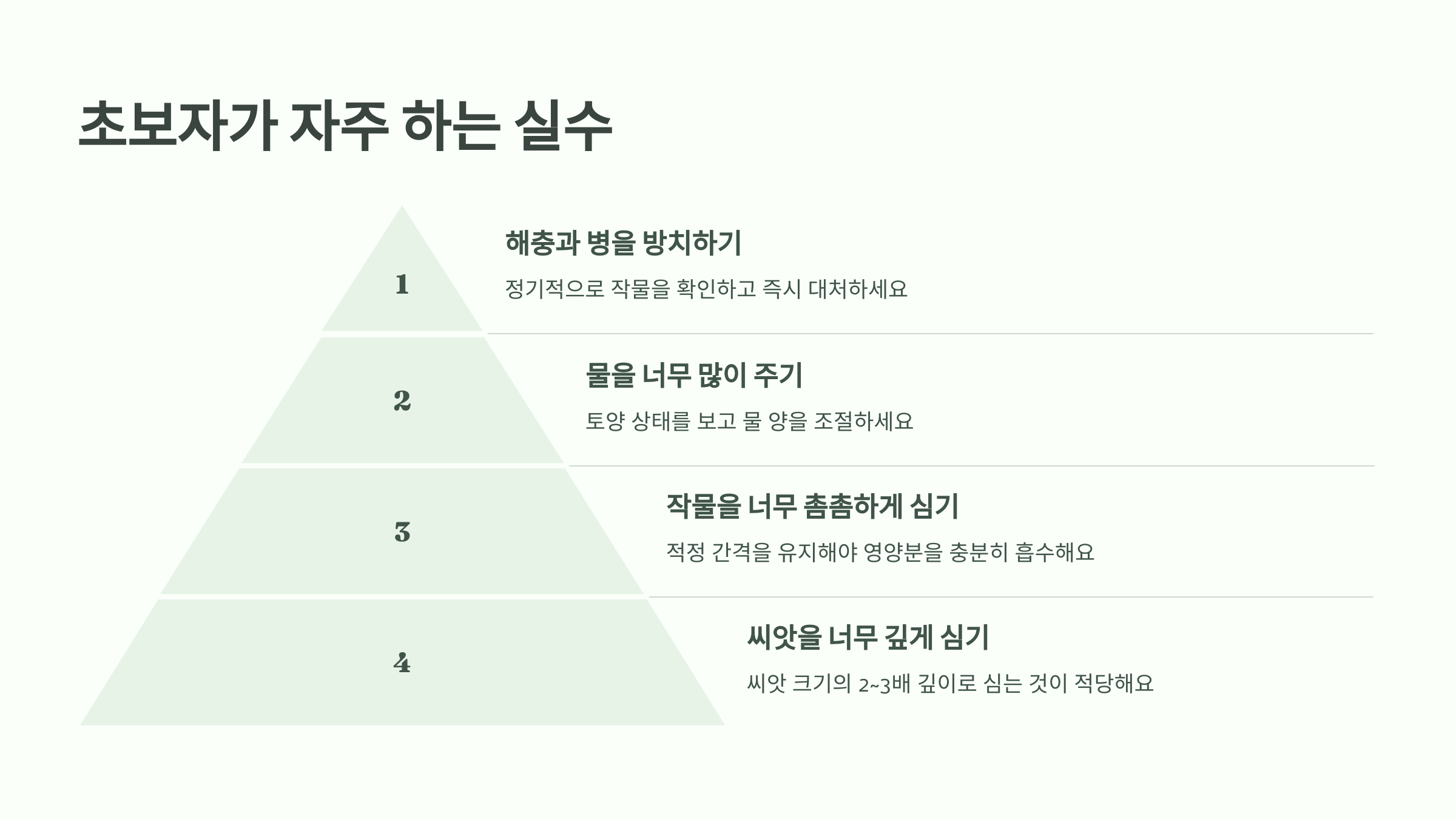 텃밭을 처음 시작할 때 흔히 하는 실수들이 있어요. 이런 실수들을 미리 알고 조심하면 작물을 건강하게 키울 수 있어요! 🌿