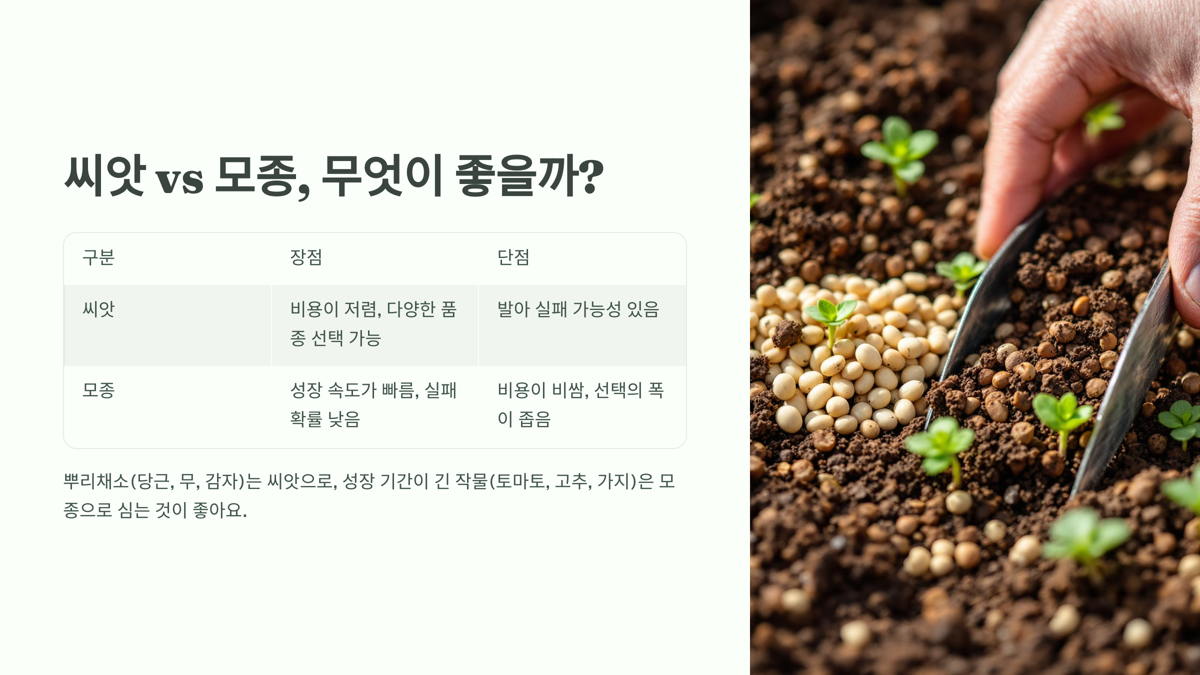 - 💰 비용을 절약하고 싶을 때 (씨앗이 더 저렴해요!)