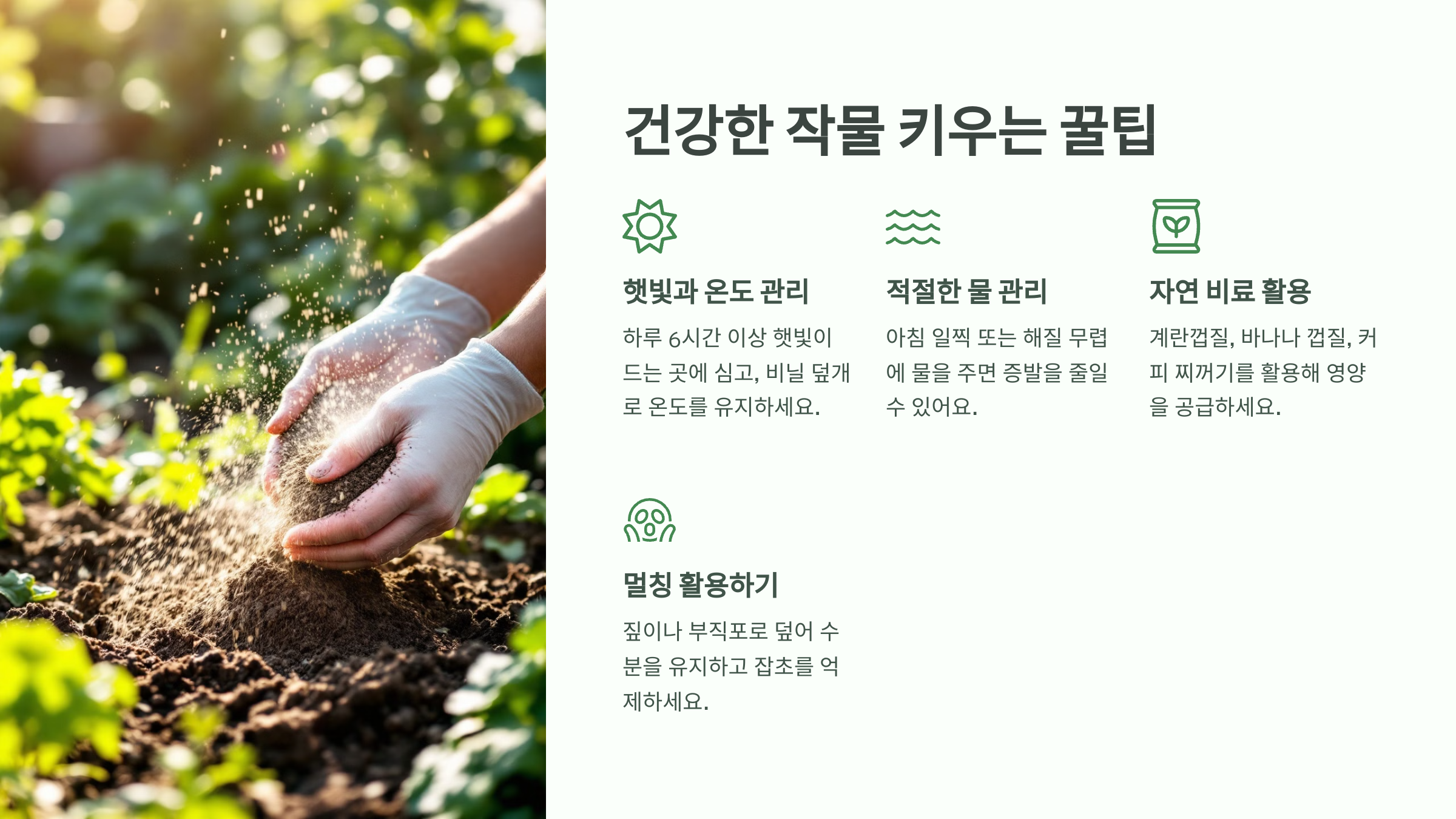 작물을 건강하게 키우려면 단순히 심고 물만 주는 것보다 환경 관리와 적절한 영양 공급이 중요해요. 몇 가지 간단한 팁만 실천해도 수확량이 훨씬 늘어날 수 있어요! 🥕🍅