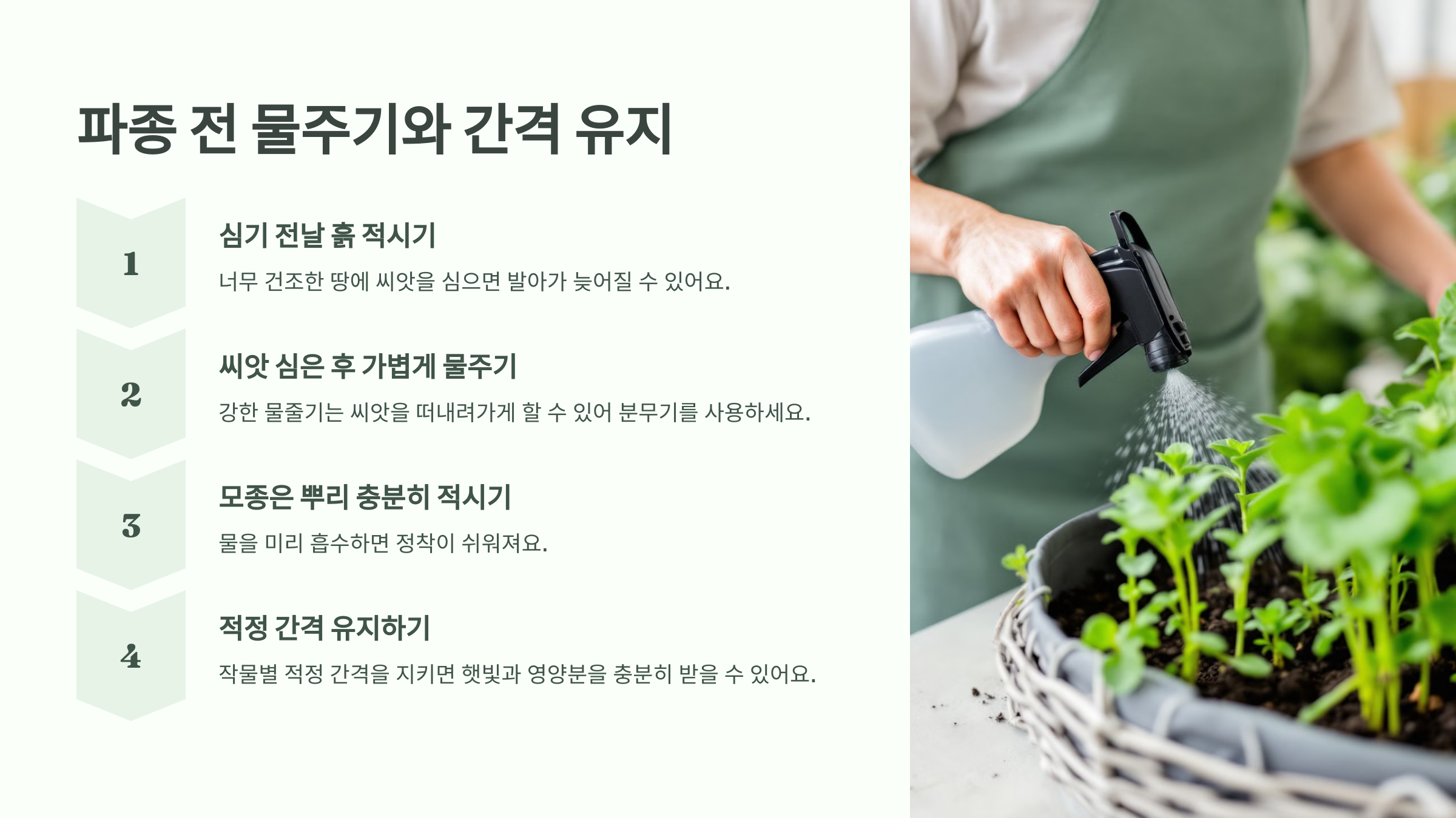 씨앗이나 모종을 심기 전 충분한 물 공급과 적절한 간격 유지가 중요해요. 작물의 건강한 성장을 위해 이 두 가지를 반드시 신경 써야 해요! 🌱