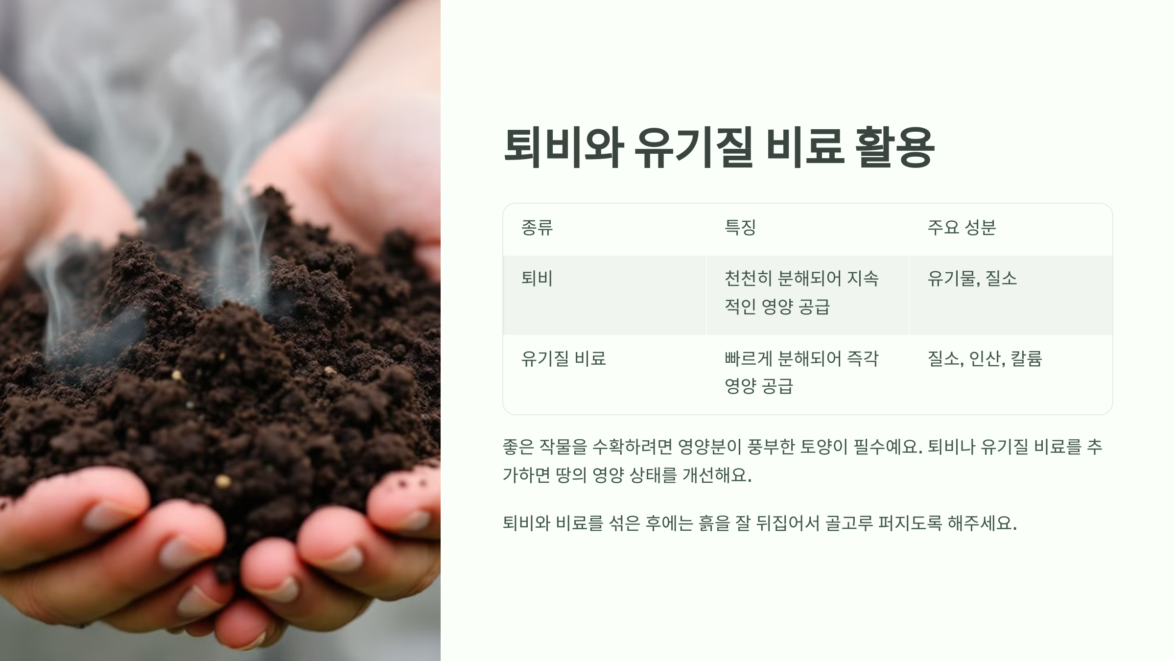 | 퇴비 | 천천히 분해되어 지속적인 영양 공급 | 유기물, 질소 |