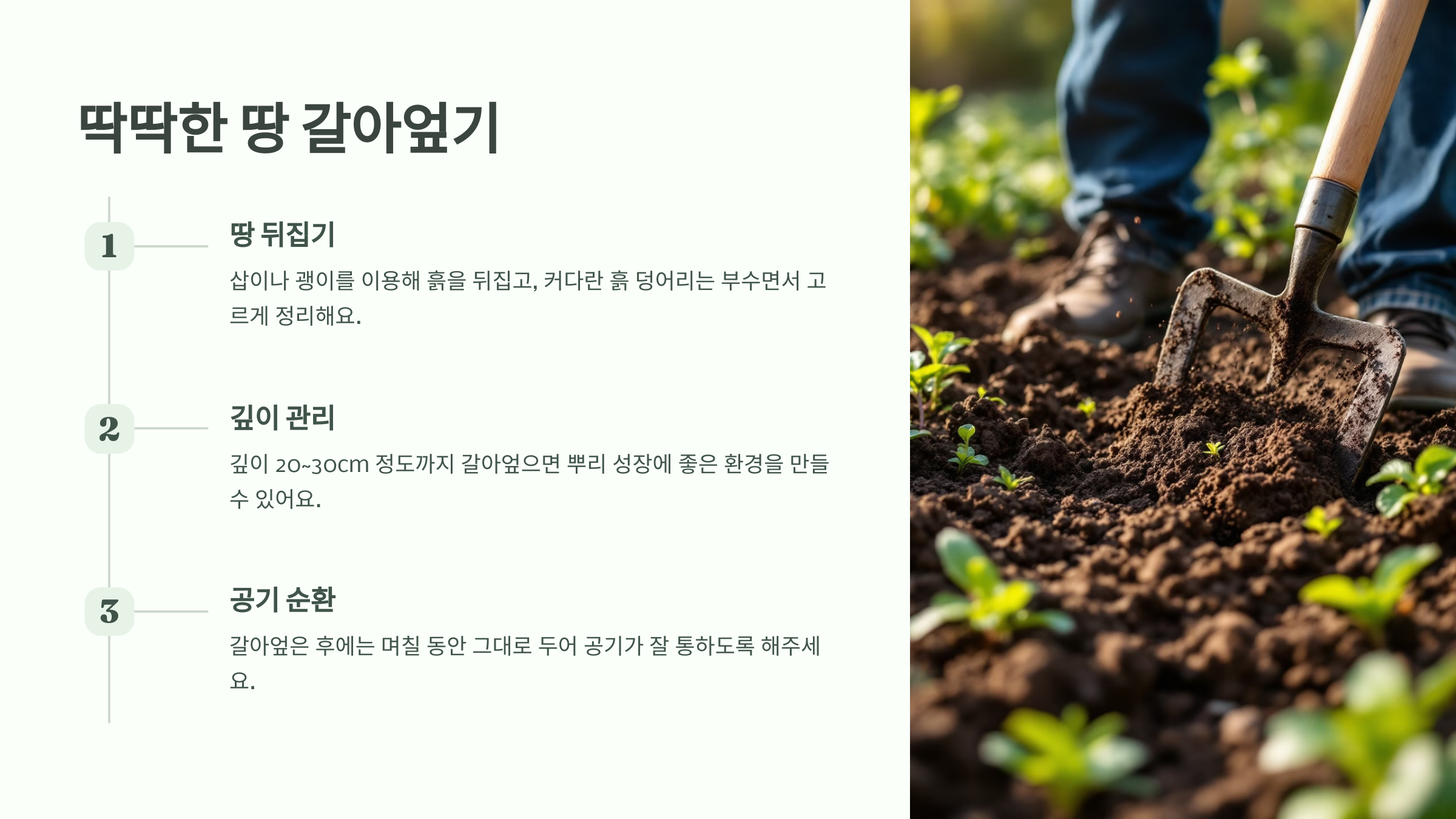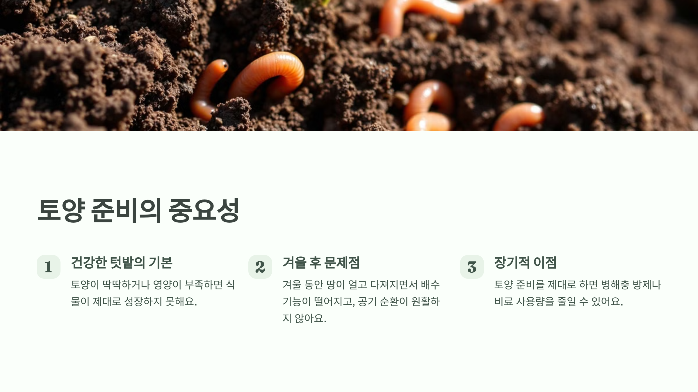 특히 겨울 동안 땅이 얼고 다져지면서 배수 기능이 떨어지고, 공기 순환이 원활하지 않을 수 있어요. 이 문제를 해결하려면 흙을 갈아엎고 퇴비를 섞어 땅을 부드럽게 만들어야 해요.