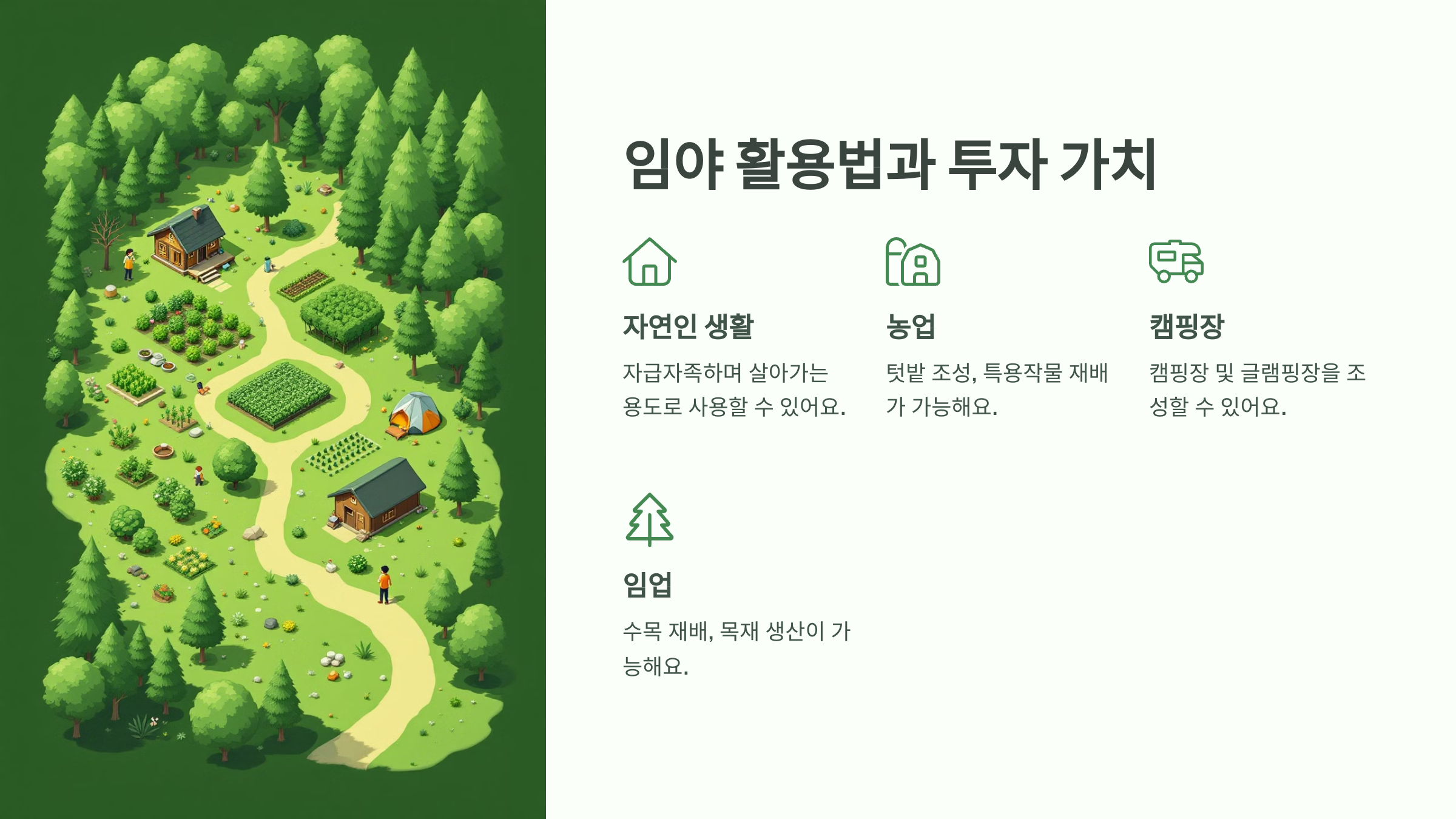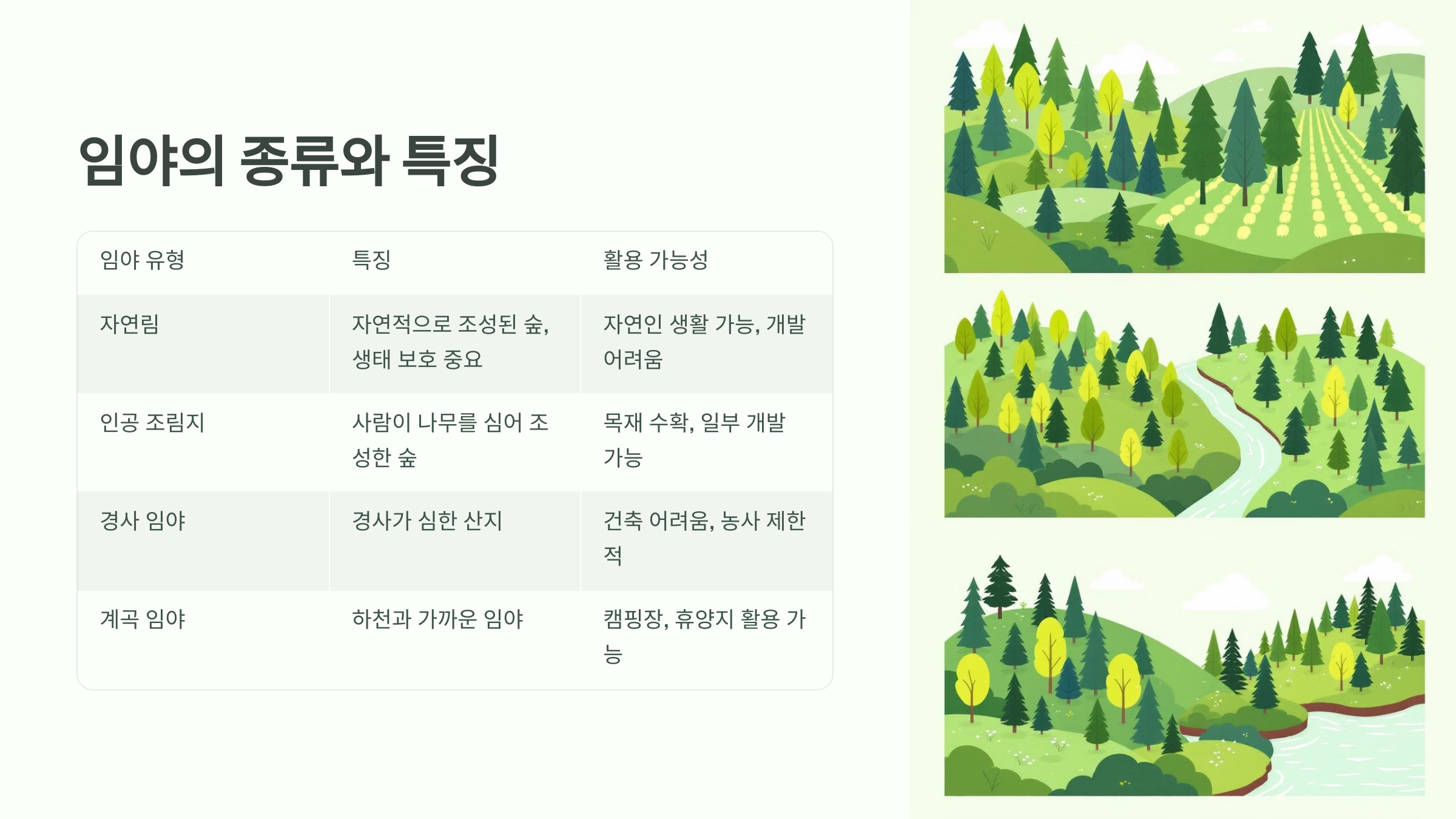 이처럼 임야의 유형마다 특성이 다르기 때문에, 내가 원하는 생활 방식에 맞는 유형을 선택하는 것이 중요해요. 예를 들어, 자연을 그대로 유지하며 살고 싶다면 '자연림'이 좋고, 경제적인 활용을 원한다면 '인공 조림지'가 적합할 수 있어요.