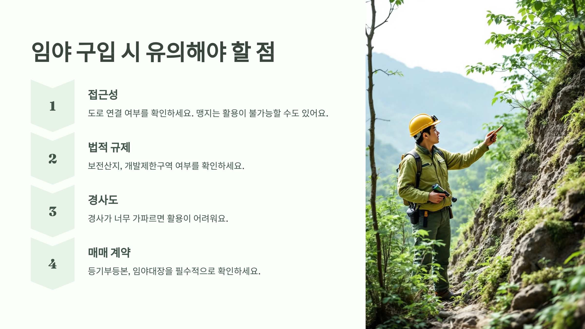 임야를 구입할 때는 반드시 주의해야 할 사항들이 있어요. 무작정 저렴한 가격만 보고 계약하면 나중에 큰 문제에 부딪힐 수 있답니다.