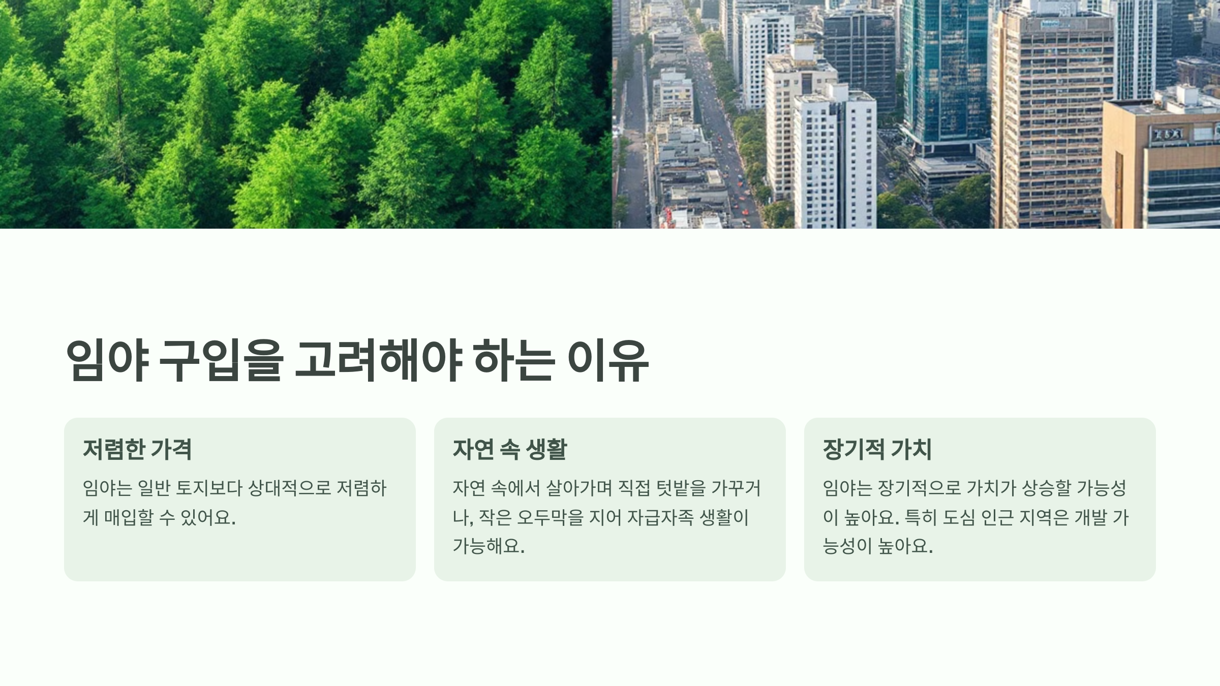임야를 구입하는 이유는 다양해요. 일부 사람들은 단순히 자연 속에서 살고 싶어서, 또 어떤 사람들은 장기적인 투자 가치를 보고 매입하죠. 무엇보다도 임야는 일반 토지보다 상대적으로 저렴하게 매입할 수 있어요.