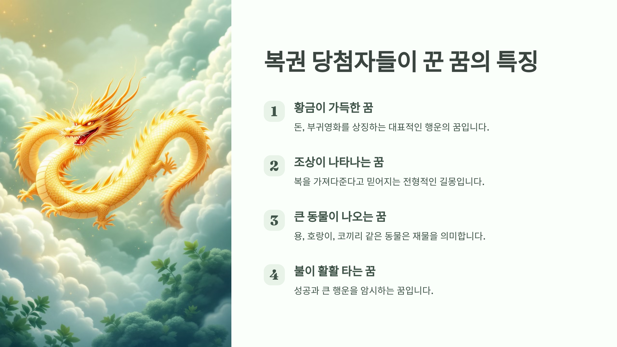 복권 당첨자들이 꾼 꿈에는 몇 가지 공통적인 특징이 있어요. 단순히 "좋은 꿈"이 아니라, 특정한 상징이 반복적으로 등장하는 경우가 많답니다.