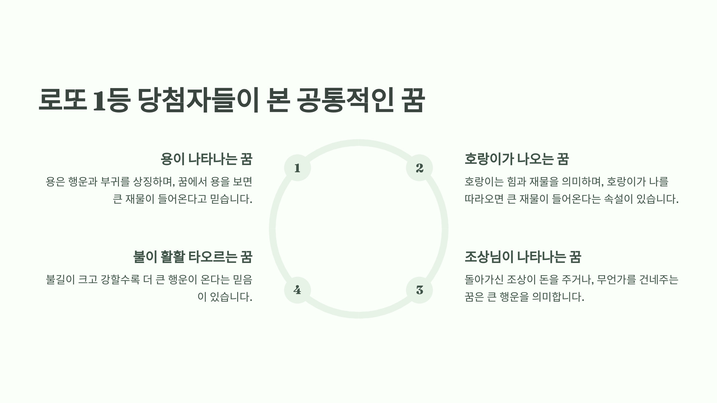 그럼, 실제로 로또 1등 당첨자들이 꾼 꿈 중에서 가장 많이 등장하는 꿈을 정리해볼게요! 🏆