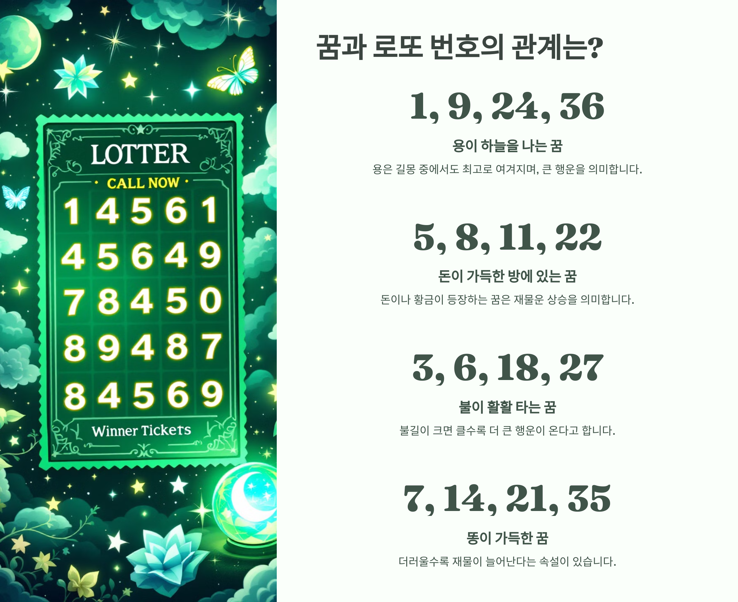 | 용이 하늘을 나는 꿈 | 1, 9, 24, 36 | 용은 길몽 중에서도 최고로 여겨지며, 큰 행운을 의미 |