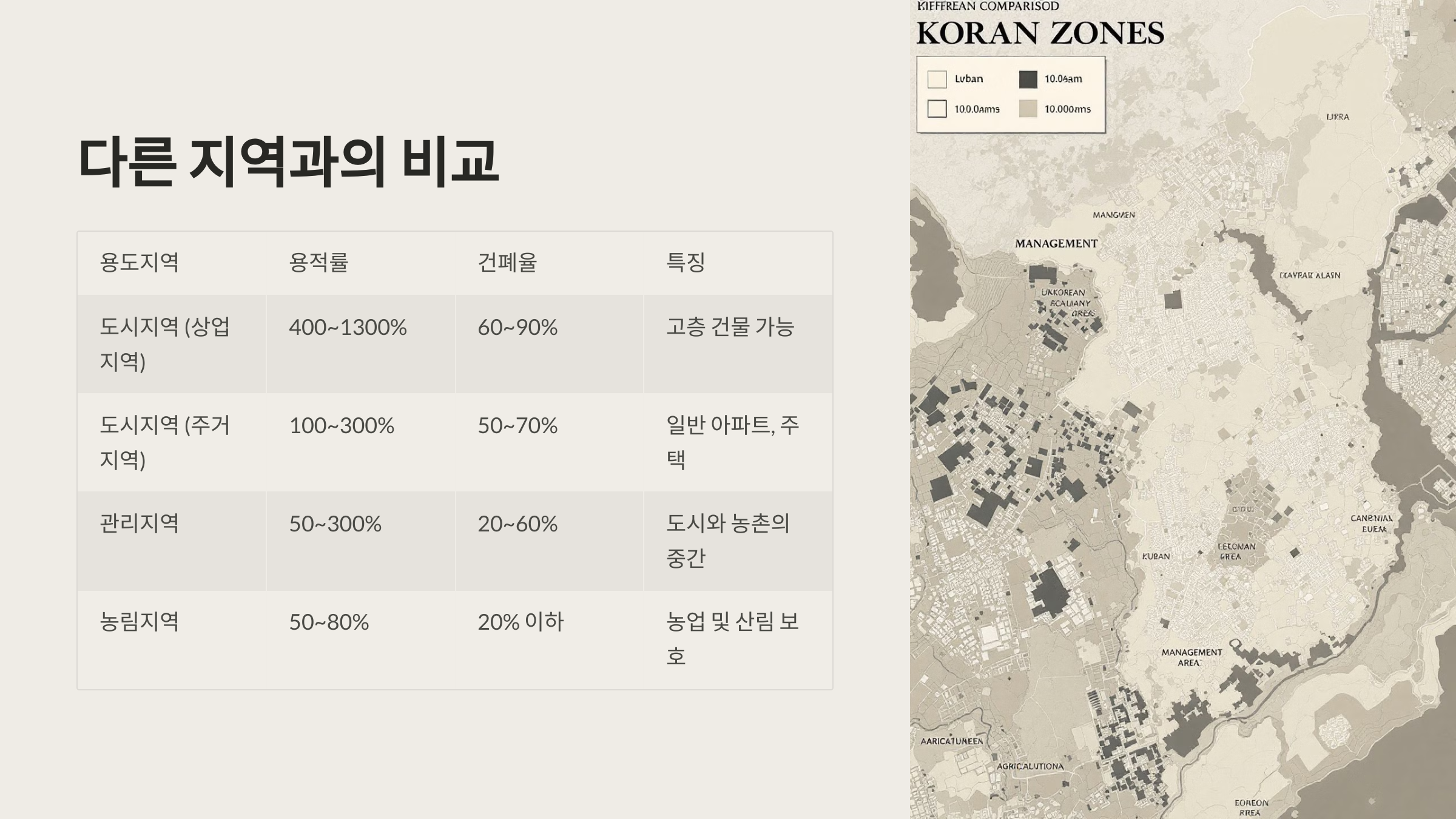 관리지역은 도시와 비도시 지역의 중간 성격을 가지기 때문에, 다른 용도지역과 비교했을 때 용적률과 건폐율이 중간 수준이에요. 도시지역보다는 낮지만, 농림지역보다는 높아요.