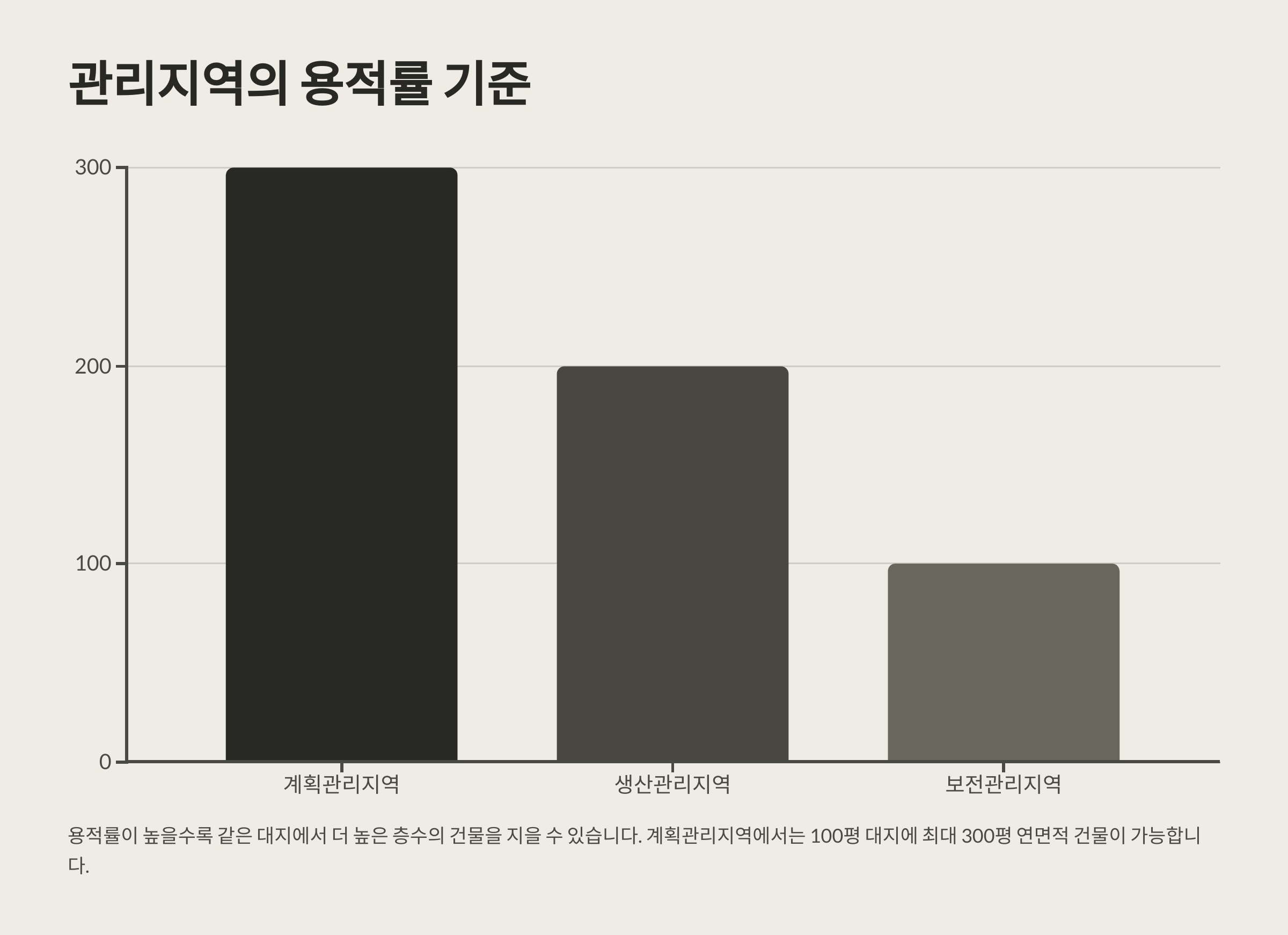 | 계획관리지역 | 100~300% | 도시화 가능성이 높아 높은 용적률 허용 |