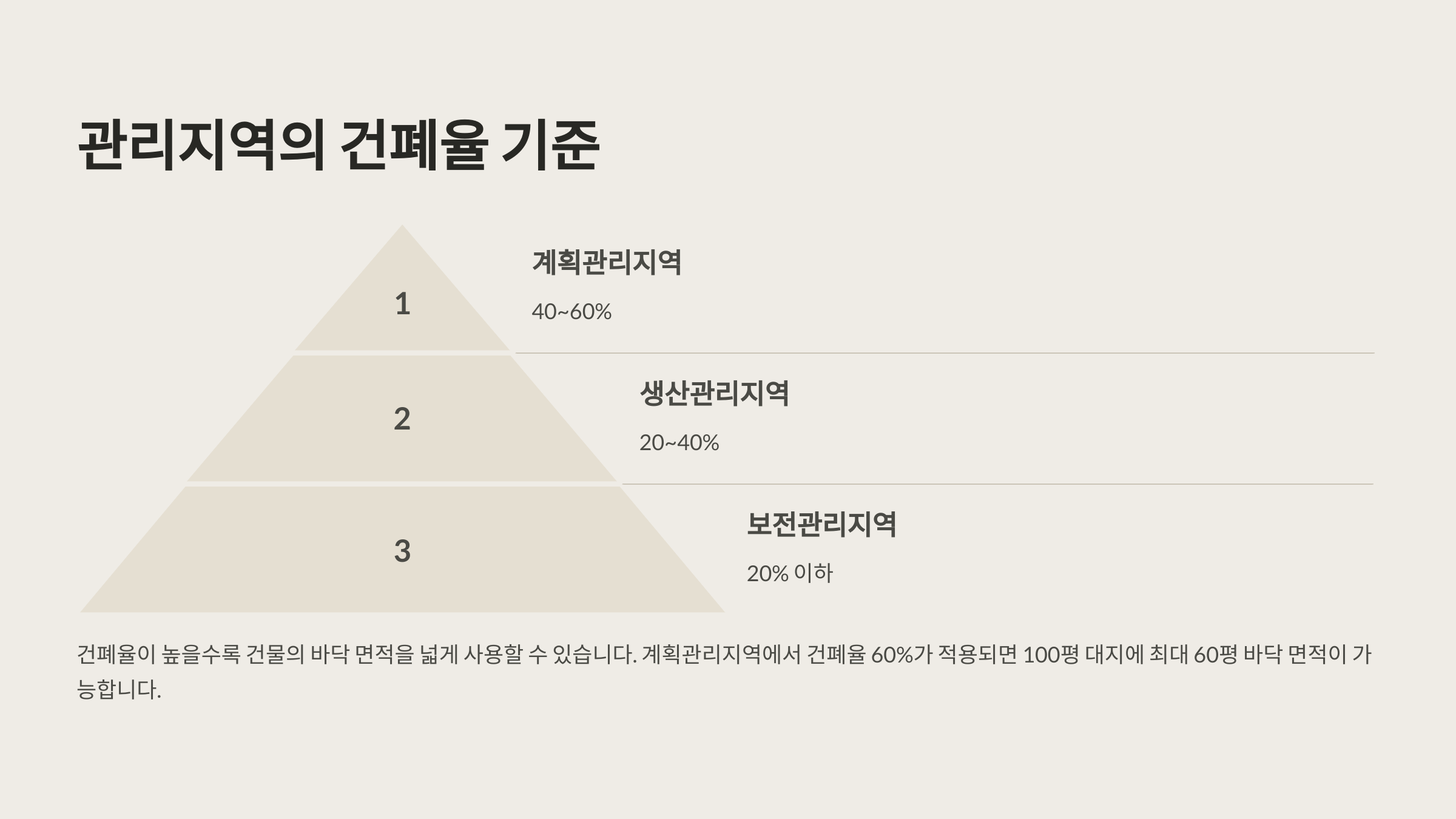건폐율이 높을수록 건물의 바닥 면적을 넓게 사용할 수 있어요. 예를 들어, 계획관리지역에서 건폐율 60%가 적용되면, 100평의 대지에 최대 60평까지 바닥 면적을 차지하는 건물을 지을 수 있어요.