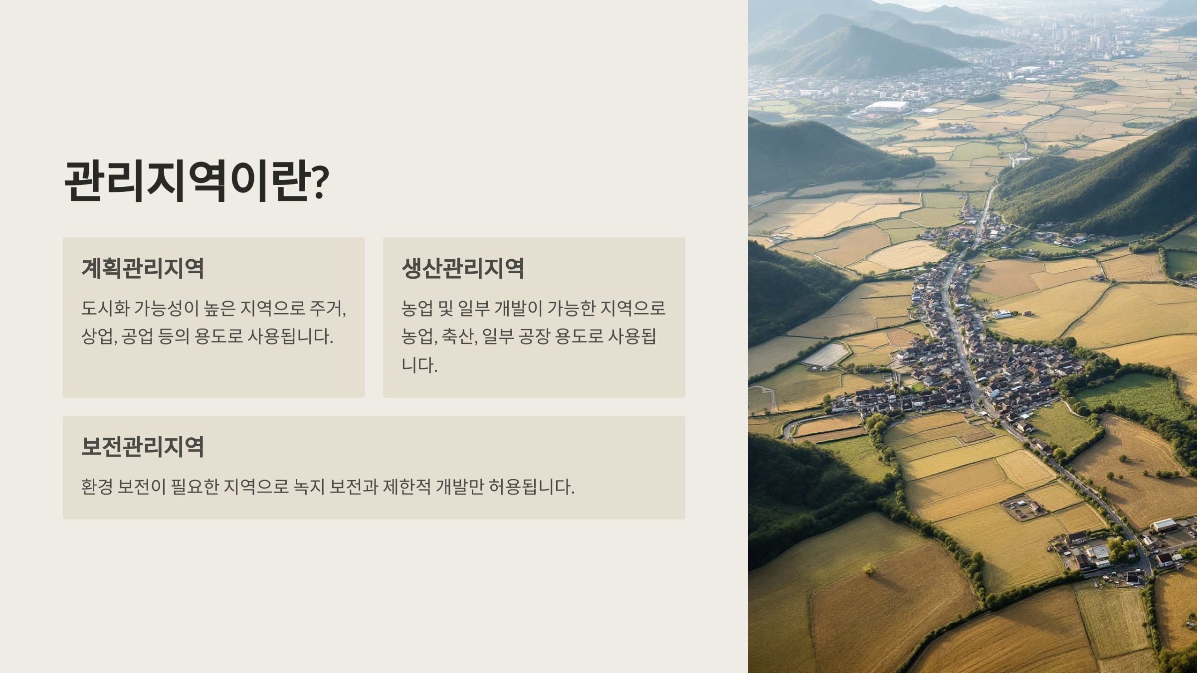 관리지역은 개발이 가능하지만, 도시지역과 달리 엄격한 규제가 적용될 수 있어요. 무작정 개발을 시작했다가 법적 문제에 부딪히지 않도록 주의해야 해요.