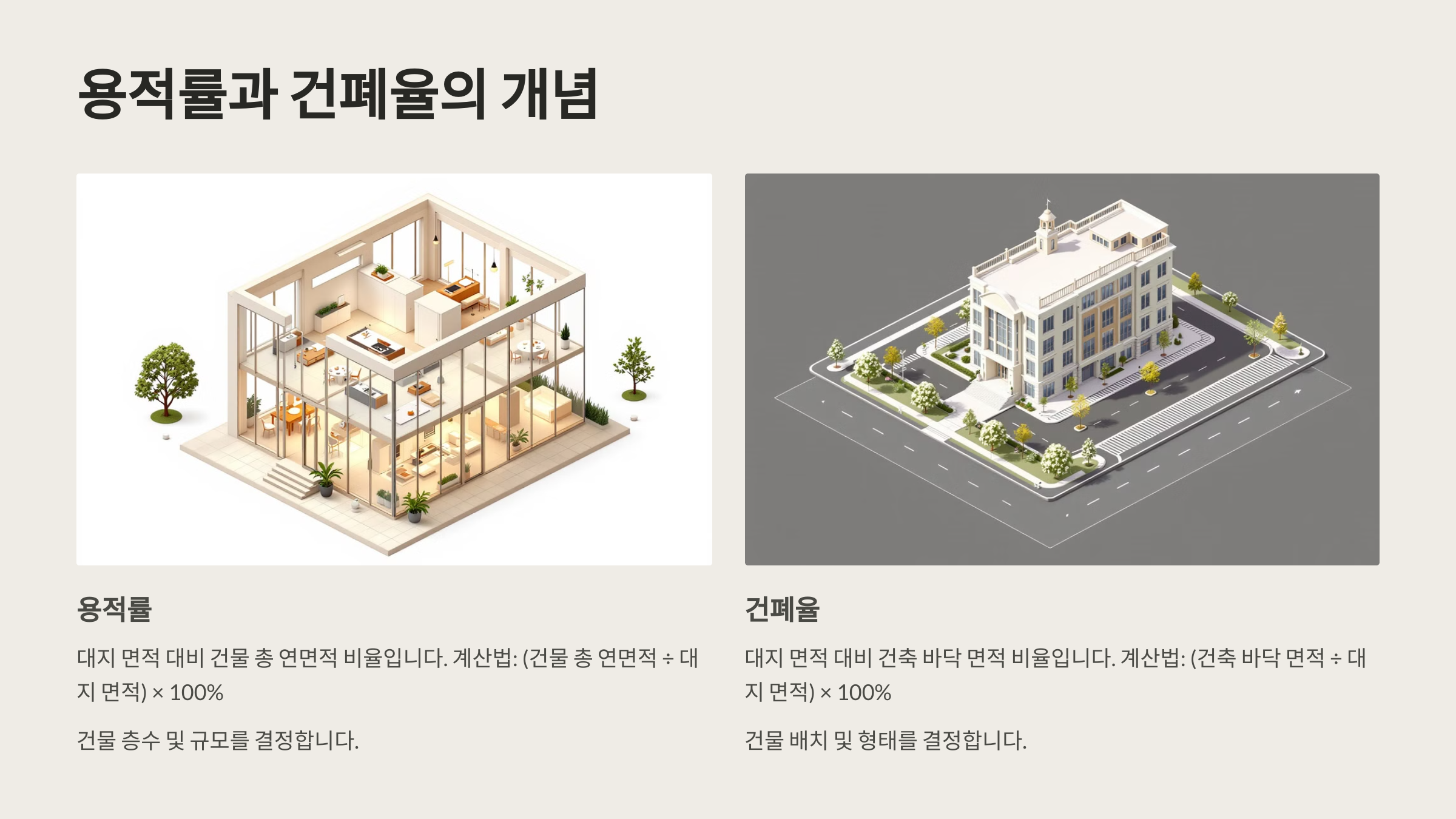 | 건폐율 | 대지 면적 대비 건축 바닥 면적 비율 | (건축 바닥 면적 ÷ 대지 면적) × 100% | 건물 배치 및 형태 결정 |