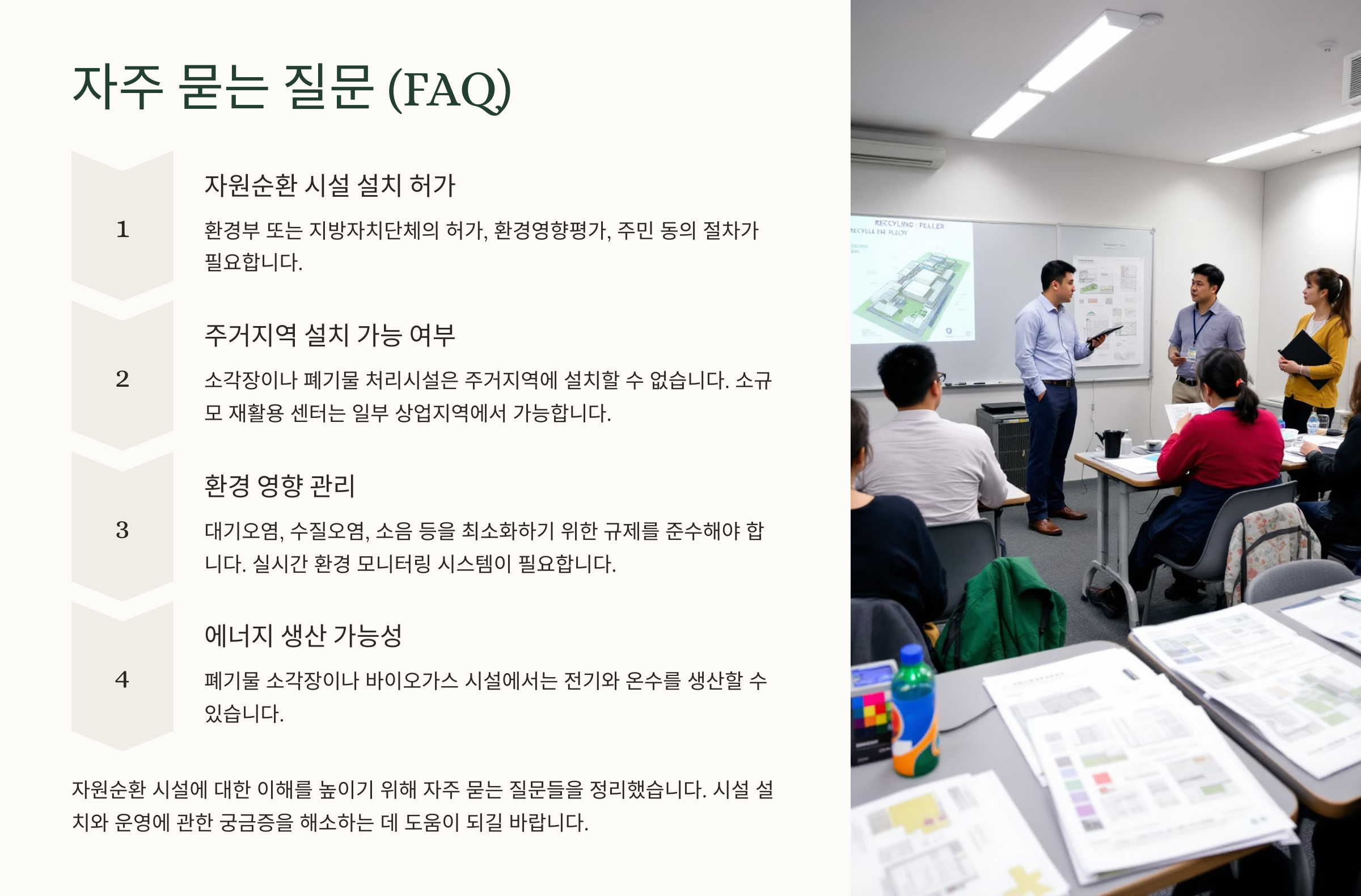 A1. 자원순환 시설을 설치하려면 폐기물관리법, 자원순환기본법 등에 따른 환경부 또는 지방자치단체의 허가를 받아야 해요. 또한 환경영향평가와 주민 동의 절차가 필요할 수 있어요.