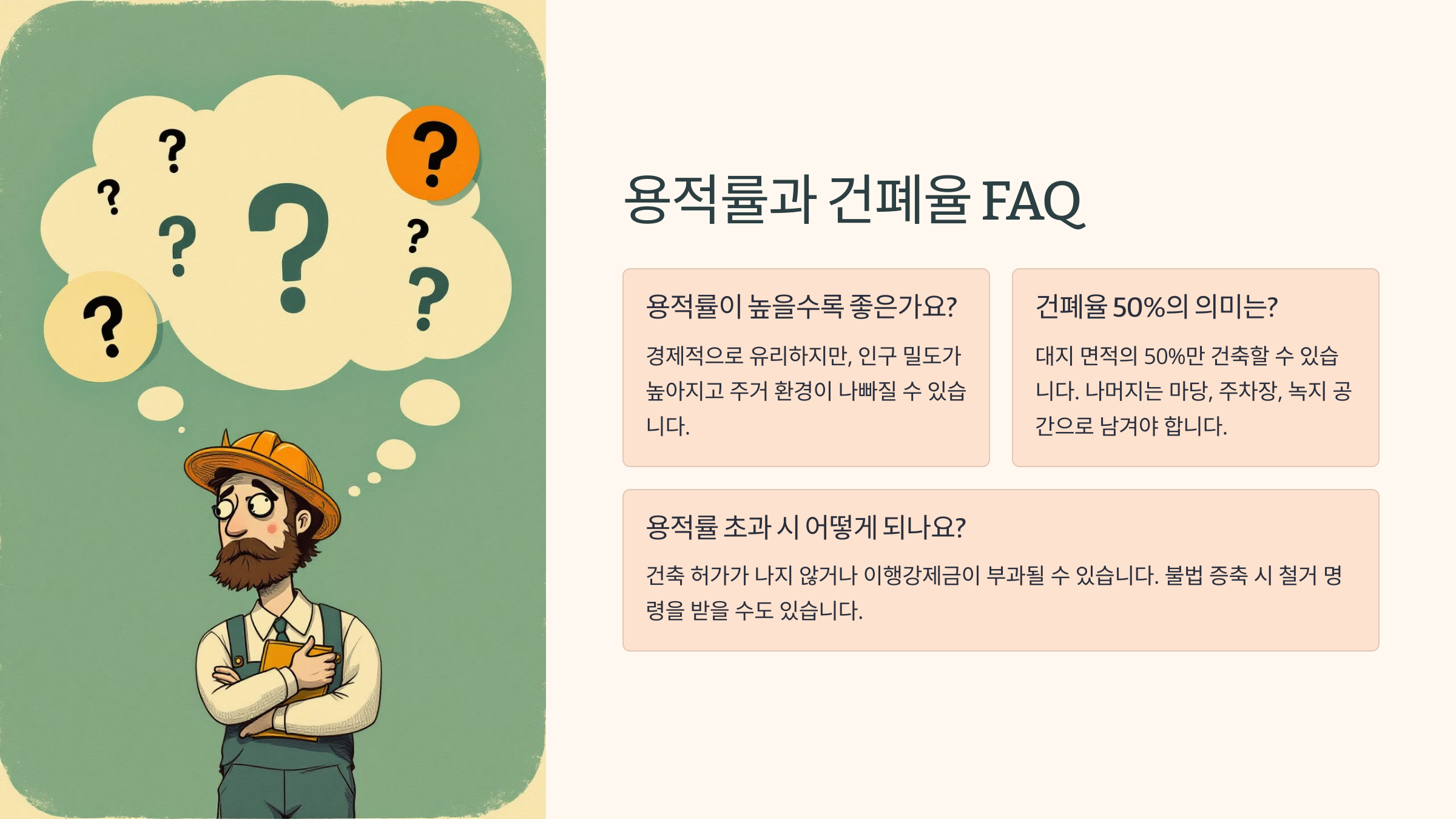 A8. 용적률이 높을수록 더 많은 세대를 공급할 수 있어 경제성이 높아져요. 재개발·재건축 추진 시 용적률 완화 여부가 사업성에 큰 영향을 미쳐요. 🏗️