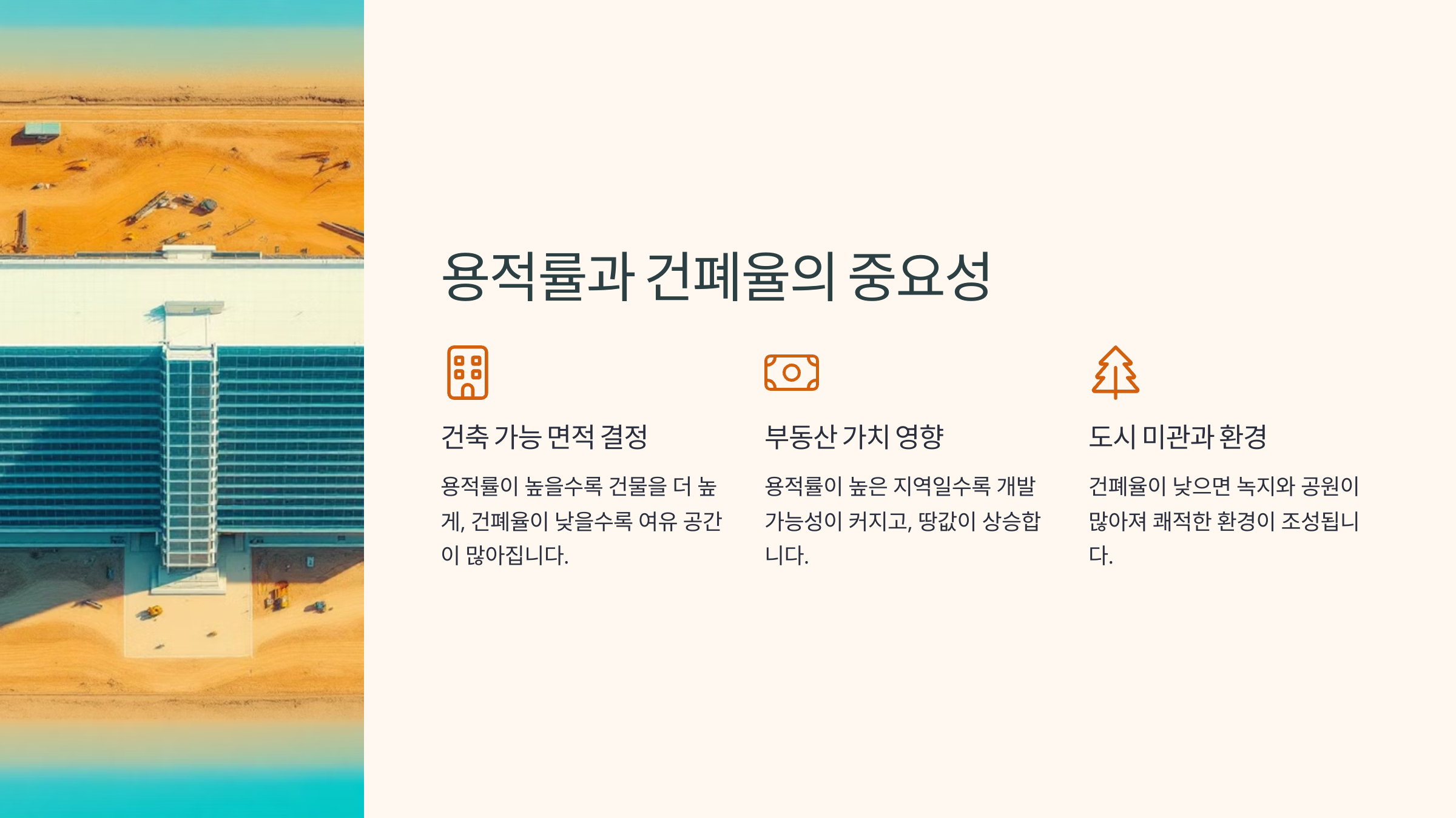| 🌳 도시 미관과 환경 | 건폐율이 낮으면 녹지와 공원이 많아져 쾌적한 환경 조성 |