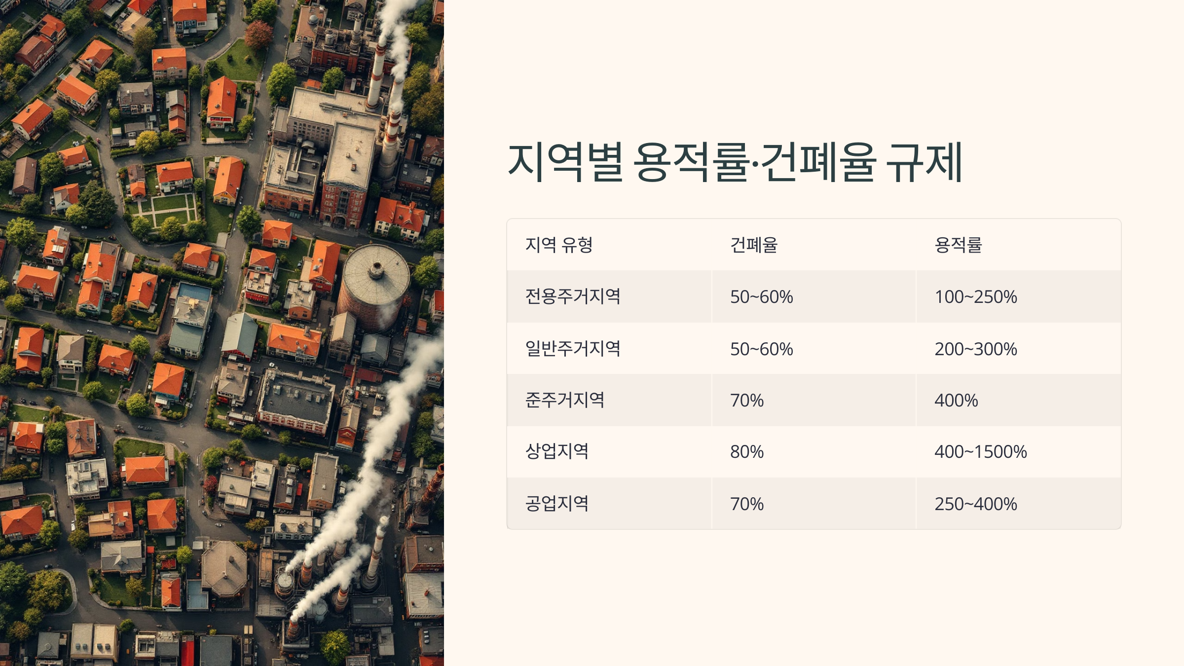 | 지역 유형 | 건폐율 | 용적률 | 특징 |