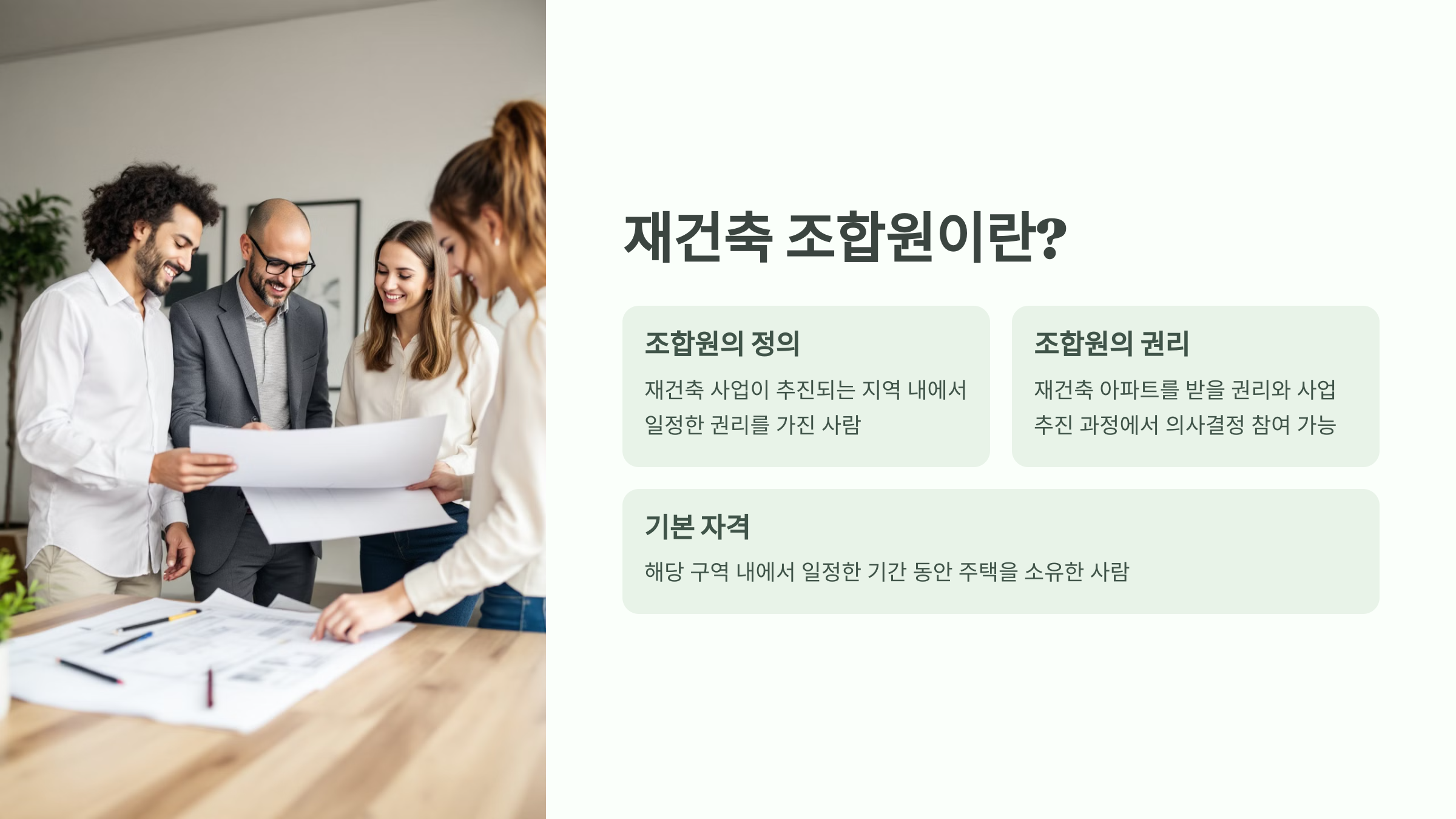 재건축 조합원이 될 수 있는 사람은 기본적으로 해당 구역 내에서 일정한 기간 동안 주택을 소유한 사람이에요. 단, 법적으로 정해진 조건을 충족해야만 조합원으로 인정받을 수 있답니다.