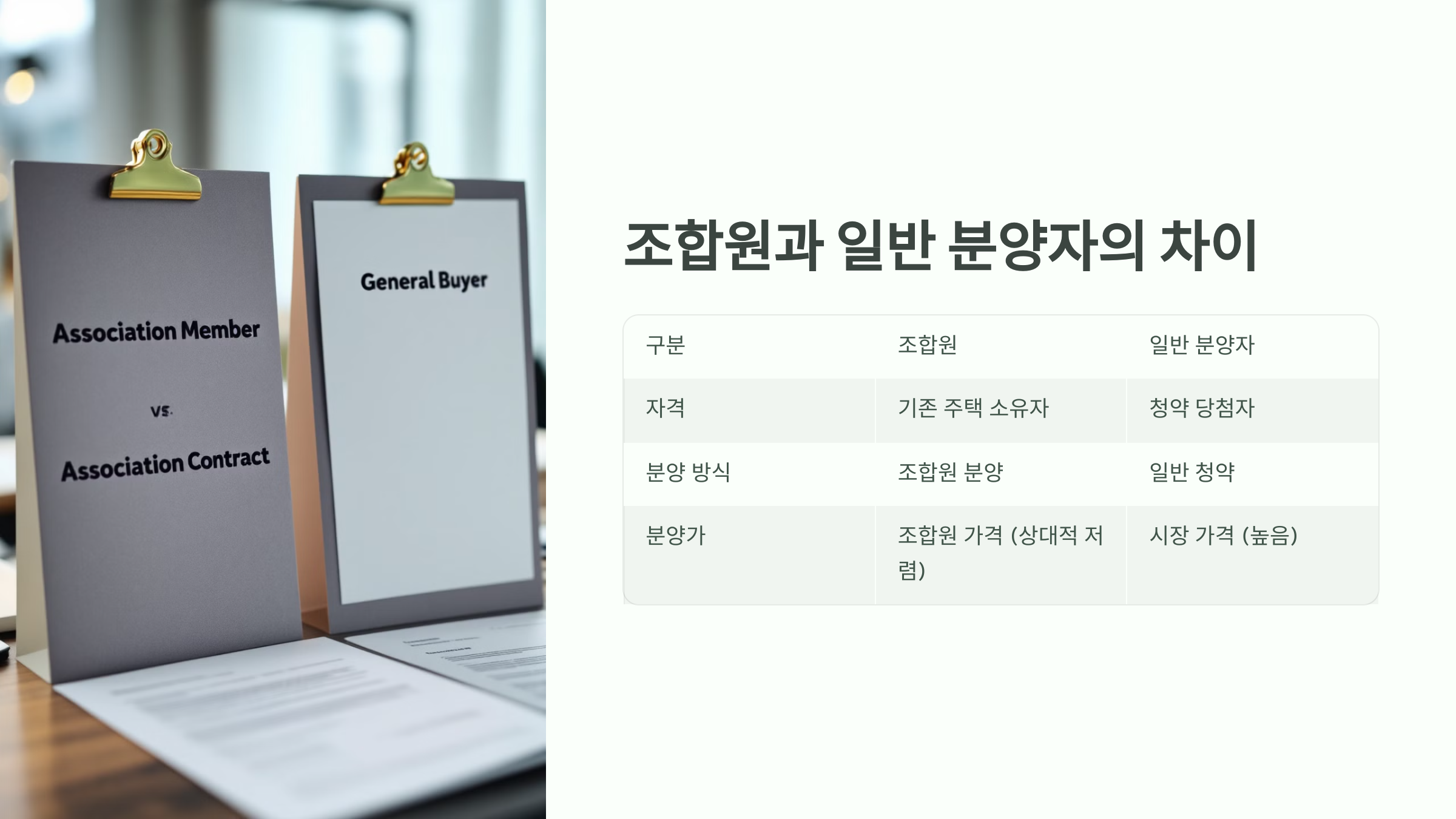 조합원은 일반 분양자보다 유리한 조건으로 새 아파트를 받을 수 있지만, 조합 운영 비용이나 추가 분담금을 부담해야 할 수도 있어요.