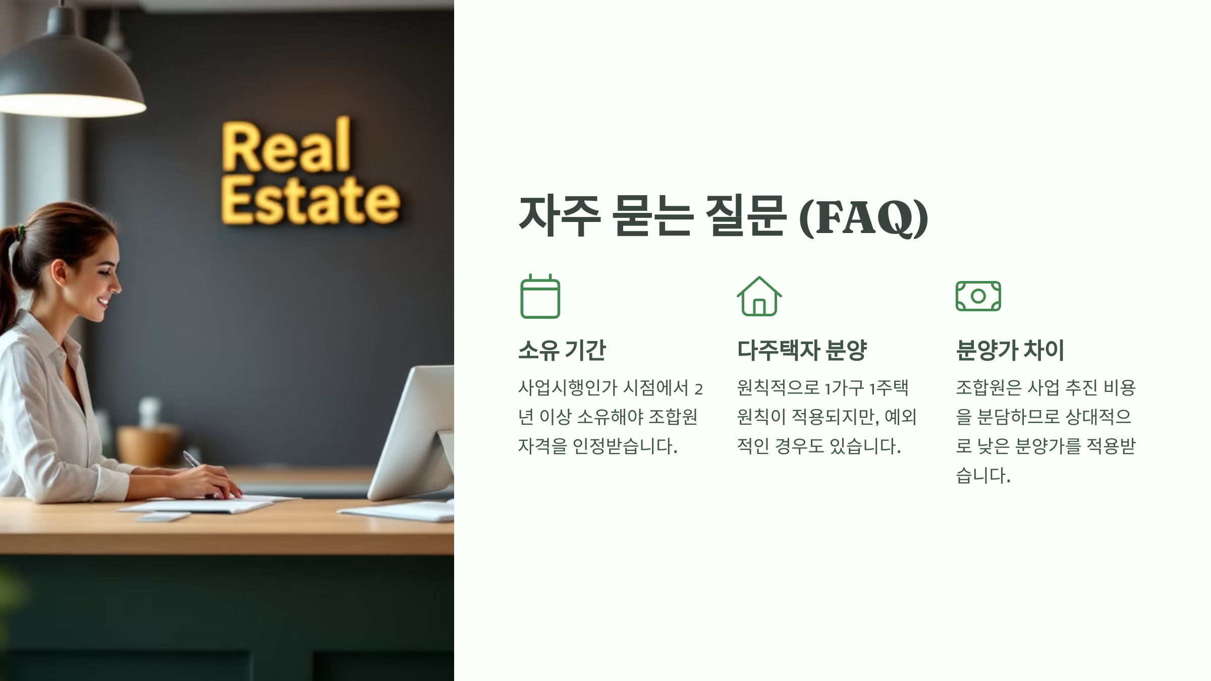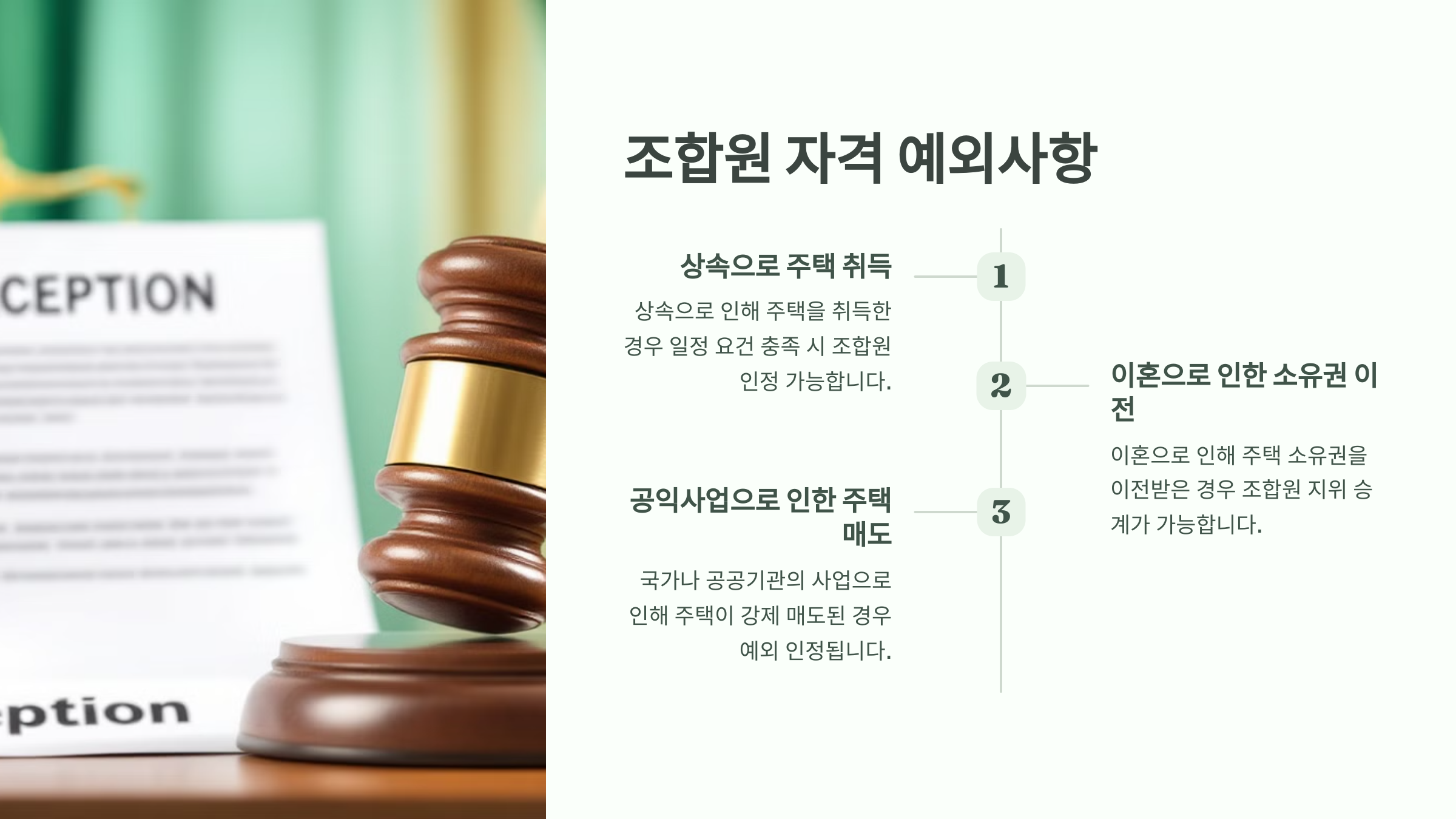 이처럼 예외적인 경우에도 조합원 자격을 받을 수 있지만, 개별적인 검토가 필요하니 꼼꼼히 확인해 보는 것이 좋아요! 👍