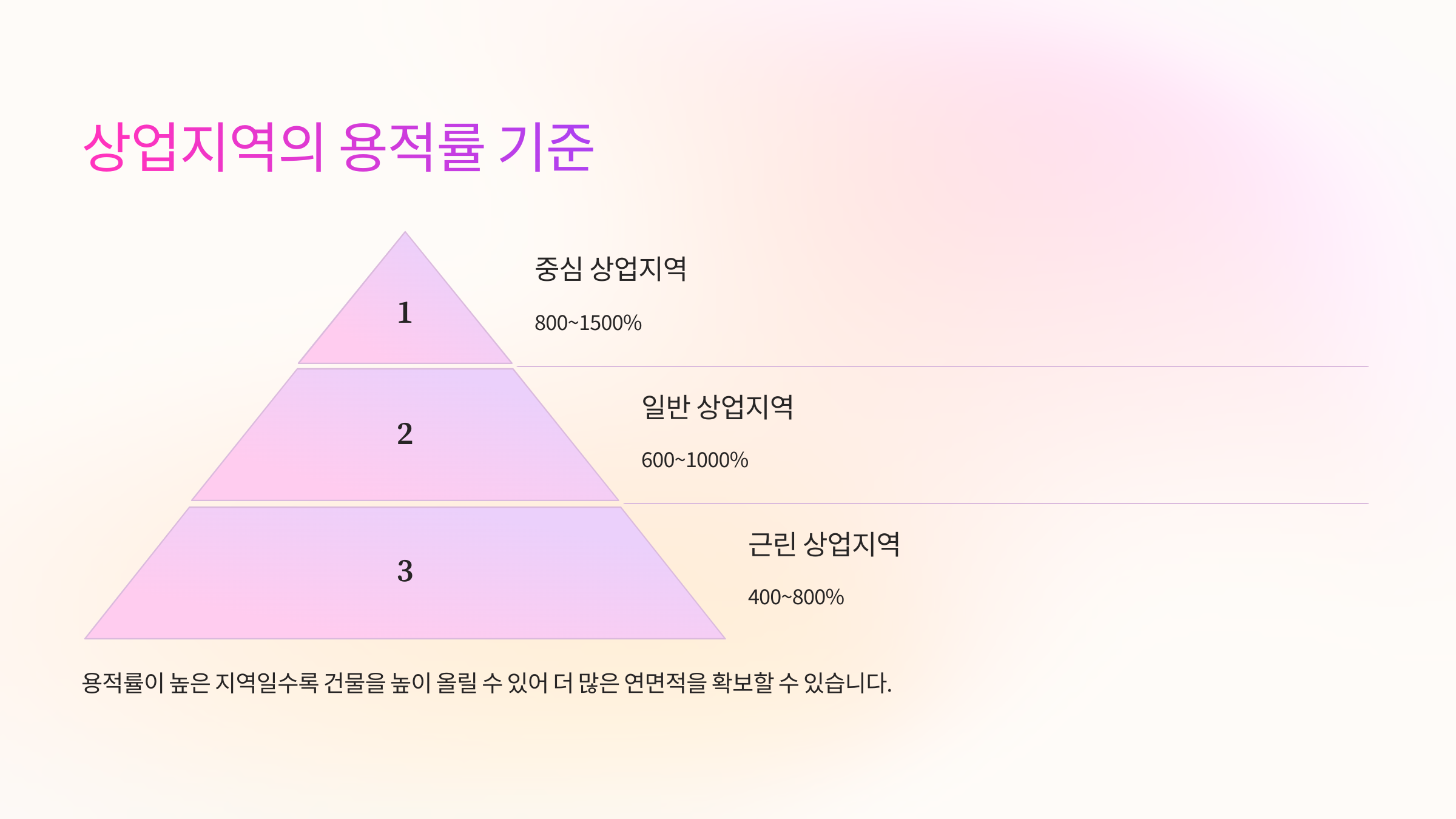 용적률은 건물의 전체 연면적이 대지 면적 대비 얼마나 되는지를 나타내는 비율이에요. 상업지역은 높은 용적률이 허용되어 고층 건물 개발이 활발한 특징이 있어요.