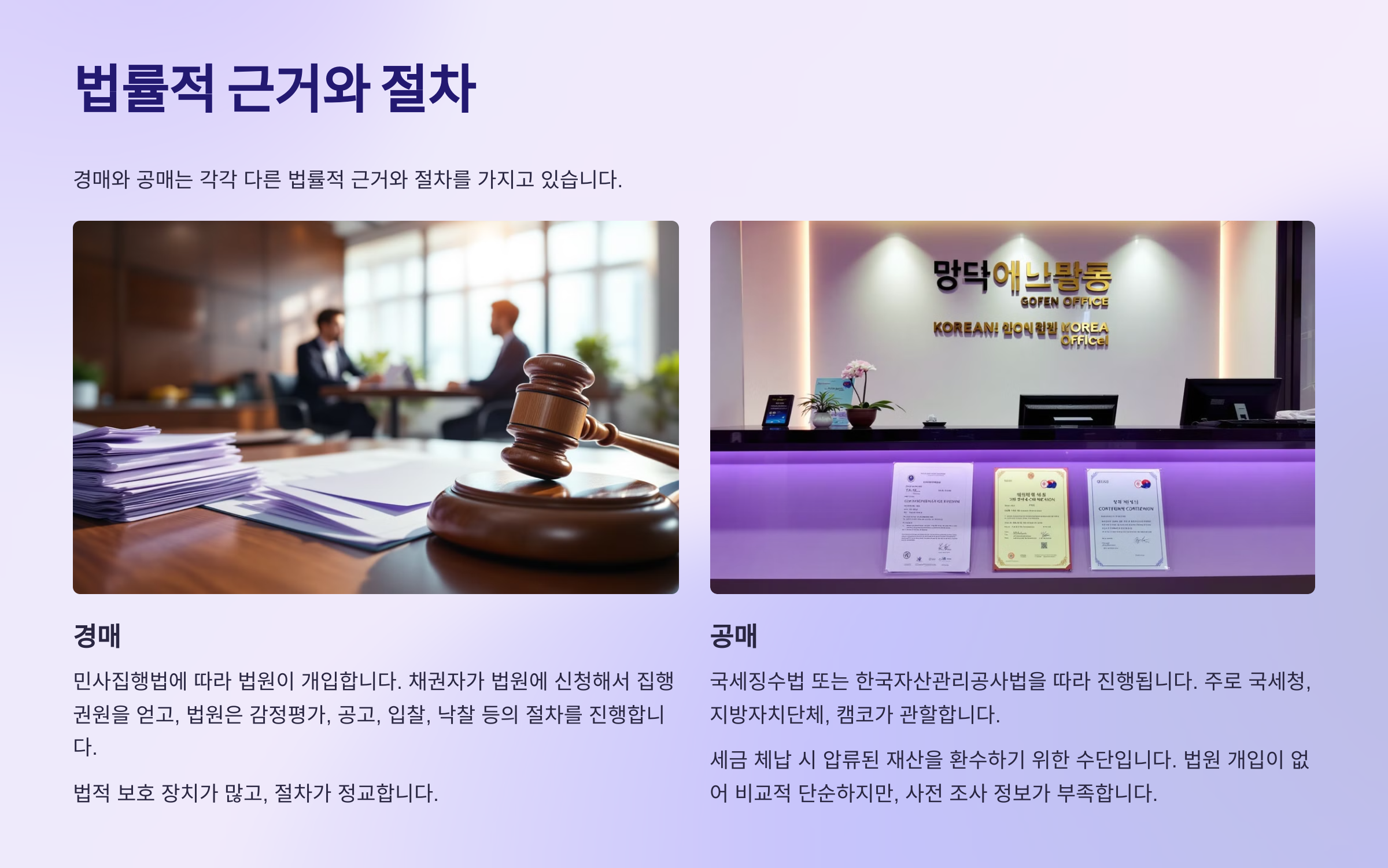 두 방식 모두 재산을 강제로 환가하는 절차지만, 경매는 민사집행법을 따르고, 공매는 국세징수법 또는 한국자산관리공사법에 기반하고 있어요. 용어는 비슷해도 근거 법률이 다른 거죠.