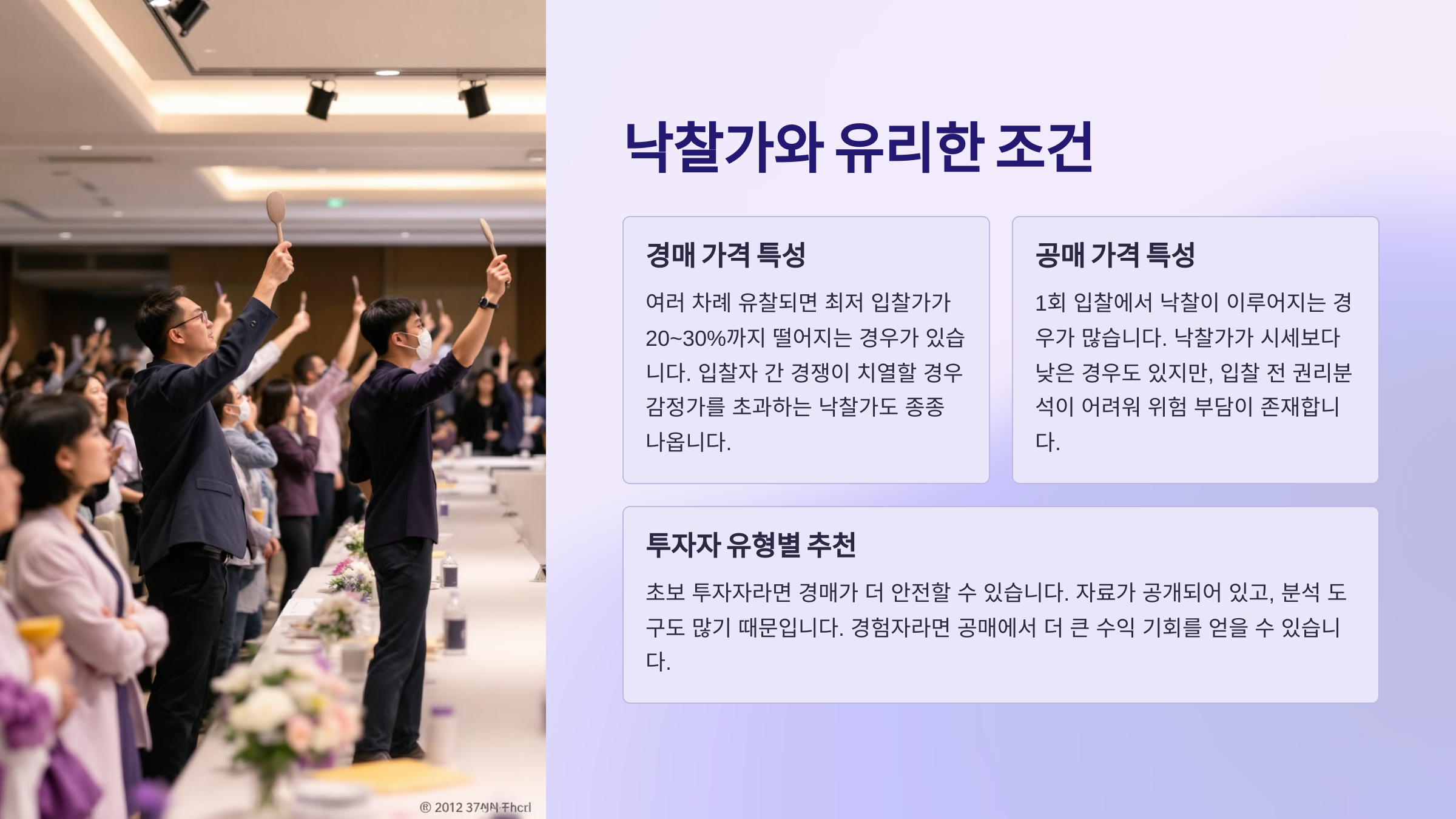 A1. 일반적으로 경매는 유찰될수록 가격이 낮아질 수 있어 더 저렴하게 낙찰될 가능성이 높아요. 하지만 공매도 초기 감정가가 낮게 책정되는 경우가 있어 상황에 따라 달라요.