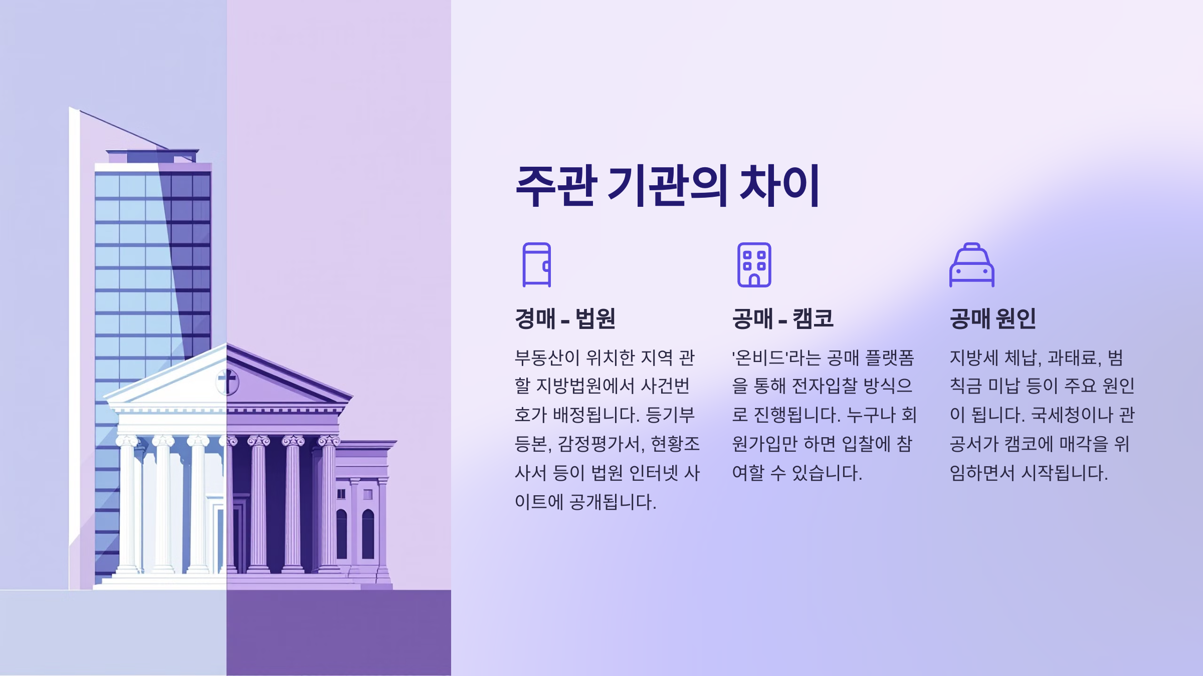 즉, 경매는 ‘사법기관(법원)’, 공매는 ‘행정기관(국세청, 캠코)’의 관할이라는 점에서 기본적인 시스템부터 다른 거예요.