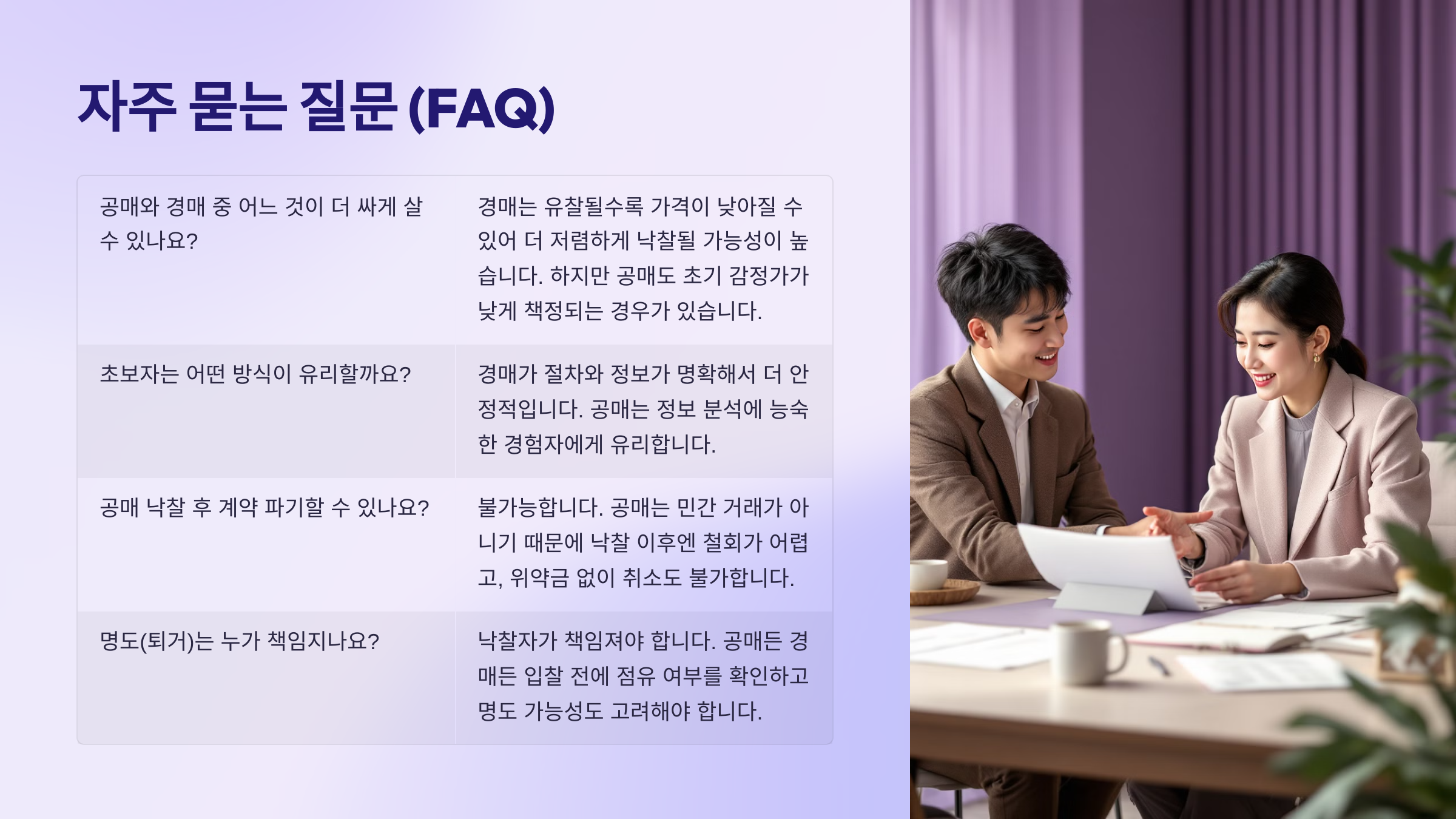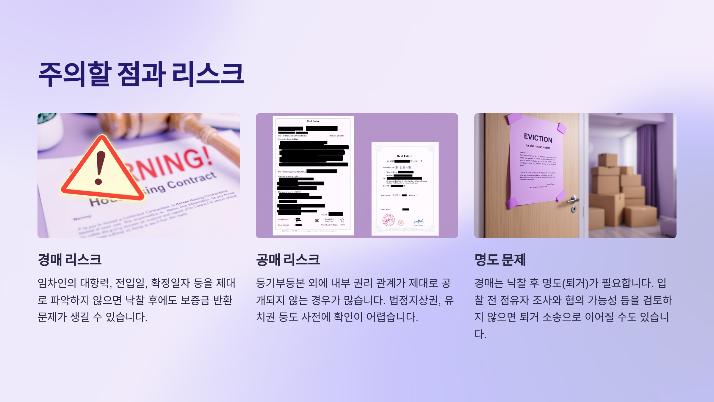 또한 경매는 낙찰 후 명도(퇴거)가 필요해요. 입찰 전 점유자 조사와 협의 가능성 등을 검토하지 않으면 퇴거 소송으로 이어질 수도 있어요.