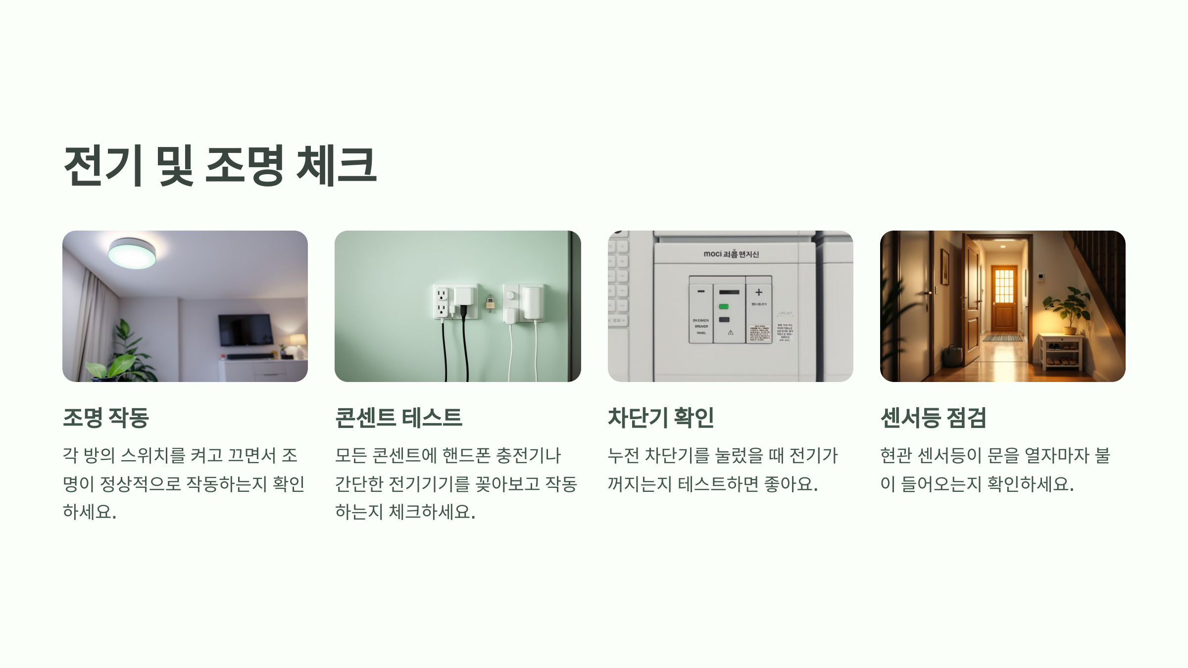 💡 작은 불빛 하나라도 안 들어오면 그게 은근히 거슬려요. 특히 콘센트 하나 고장나면 난감하니까 미리 전부 확인해보세요!