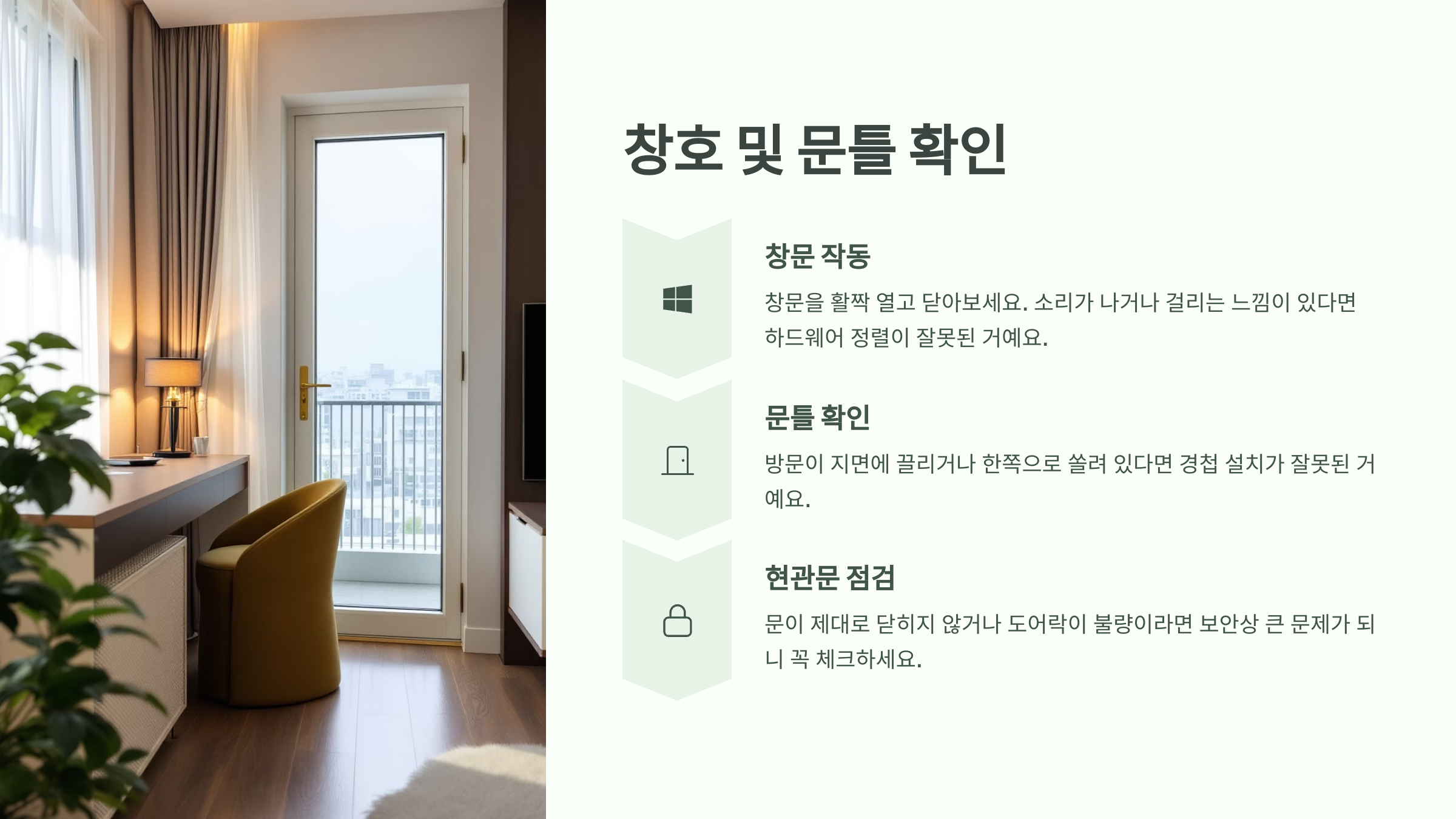 🚪 창문 하나가 덜컥거리면 마음까지 불안해지죠! 창호는 단열, 방음, 방범까지 다 연결되는 핵심이니까 입주 전 체크는 필수예요!