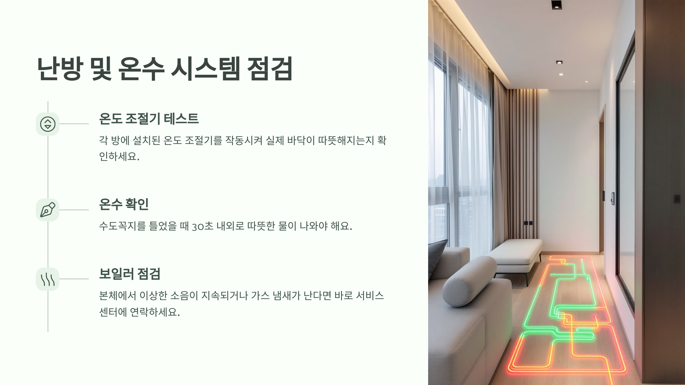 난방/온수 시스템은 겨울철뿐 아니라 사계절 내내 생활에 영향을 주는 요소니까 꼼꼼하게 확인해두는 게 필수예요. 특히 바닥 난방은 한 번 고장 나면 수리도 어렵고 비용도 커서 입주 전에 확인하는 게 가장 좋아요.