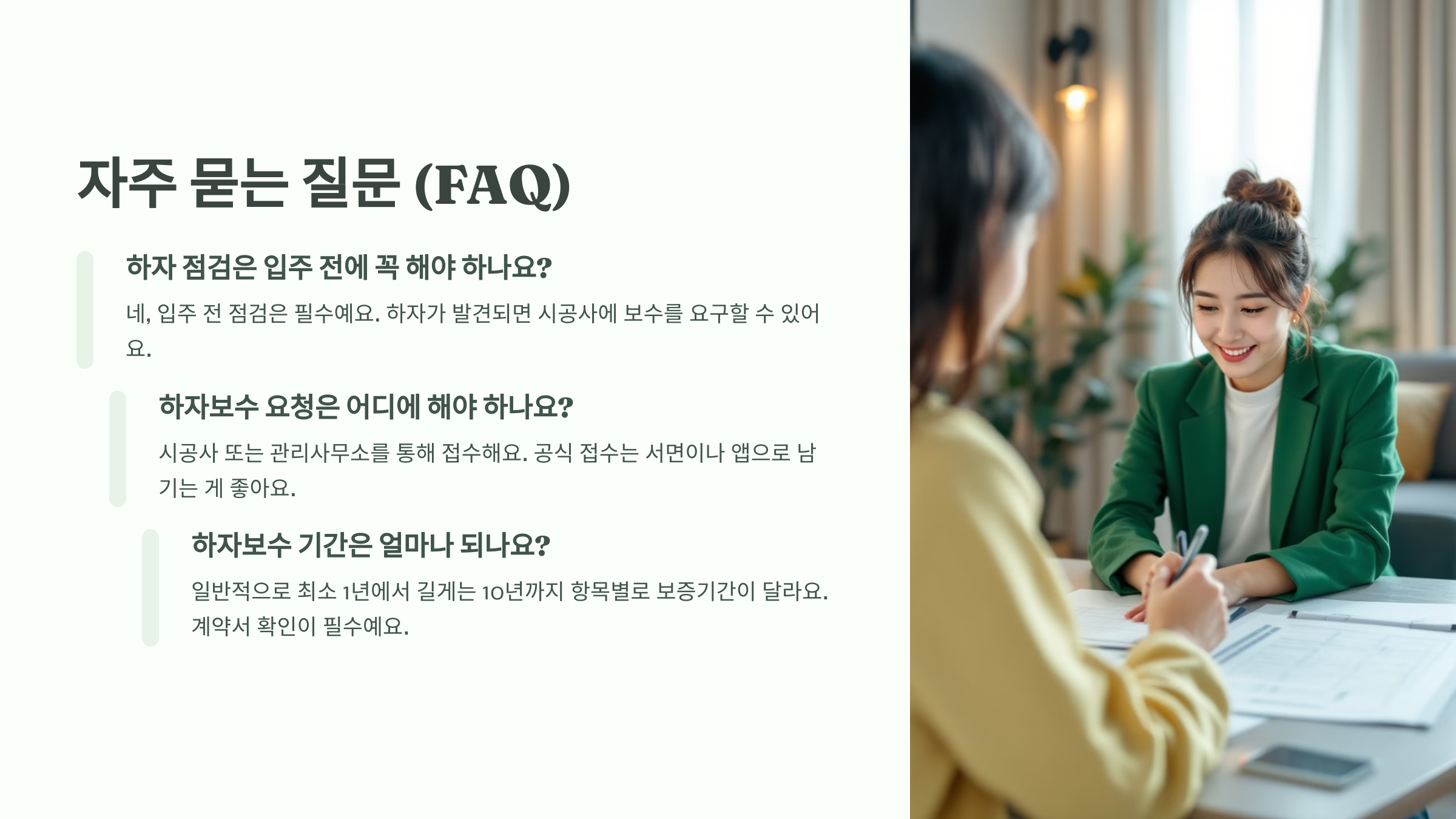 A8. 일반적으로 최소 1년에서 길게는 10년까지 항목별로 보증기간이 달라요. 계약서 확인이 필수예요.