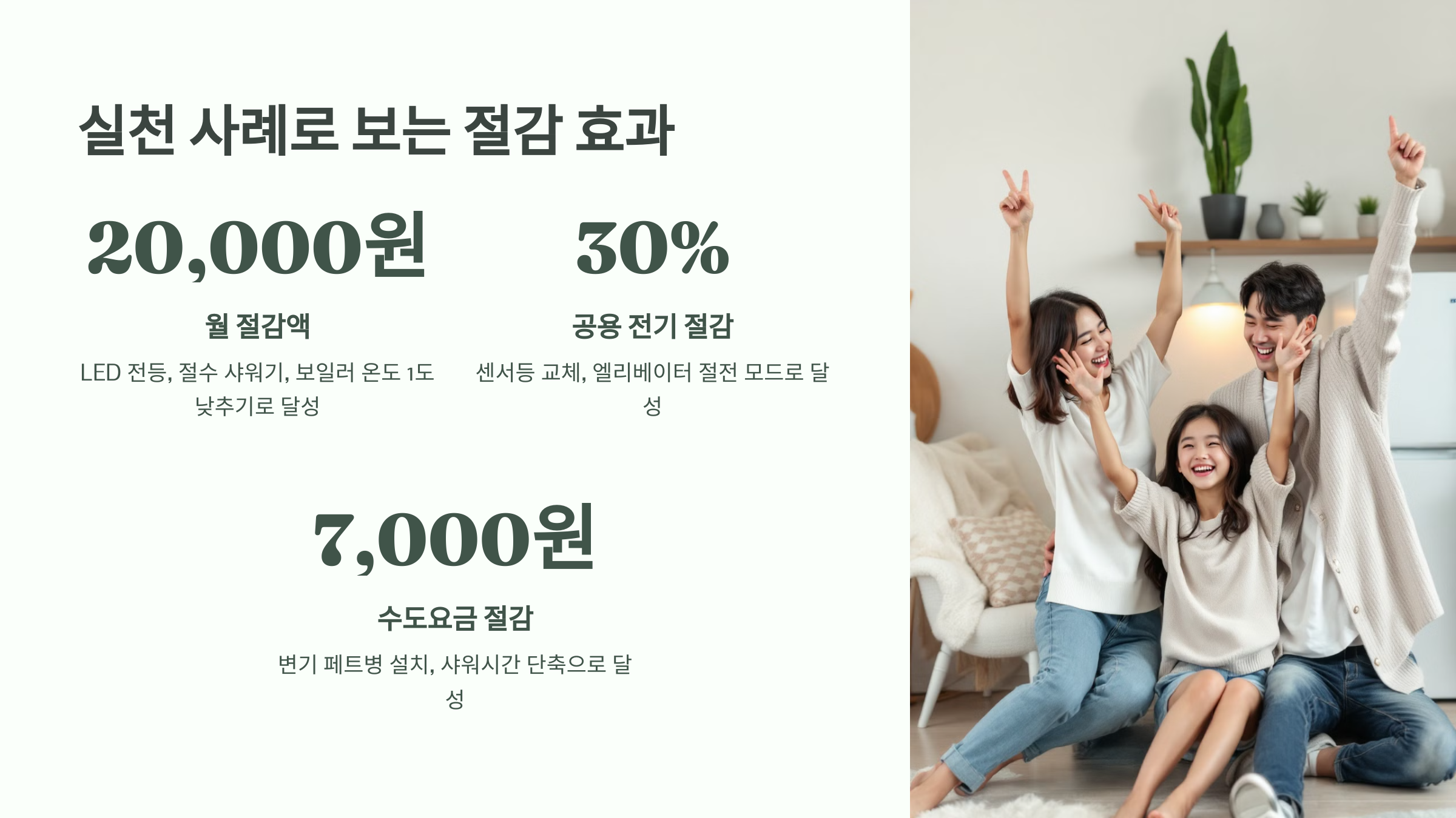서울에 사는 34평 아파트 주민 박씨 가족은 작년부터 본격적인 절약 프로젝트를 시작했어요. LED 전등 전환, 절수 샤워기 설치, 보일러 온도 1도 낮추기만 했는데 3개월 후 관리비가 월 2만 원 넘게 줄었답니다.