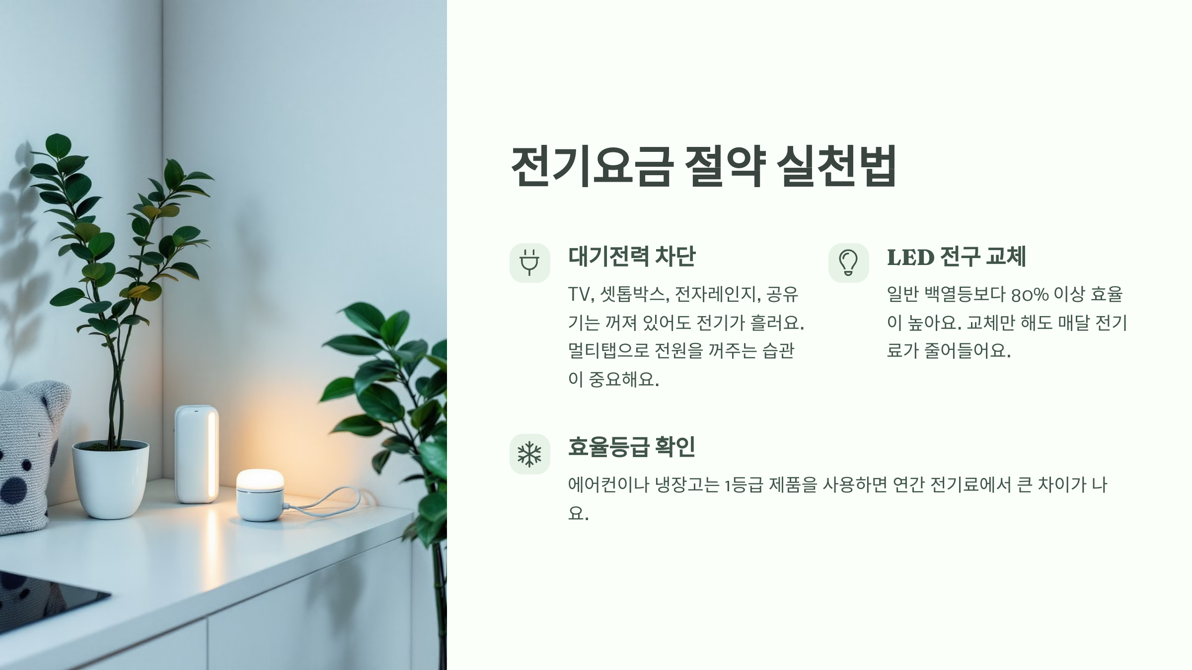 전기요금 절약의 핵심은 '낭비되는 대기전력 차단'이에요. 특히 TV, 셋톱박스, 전자레인지, 공유기처럼 꺼져 있어도 전기가 흐르는 제품들이 많거든요. 이런 기기들은 멀티탭에 연결해 전원을 꺼주는 습관이 정말 중요해요.