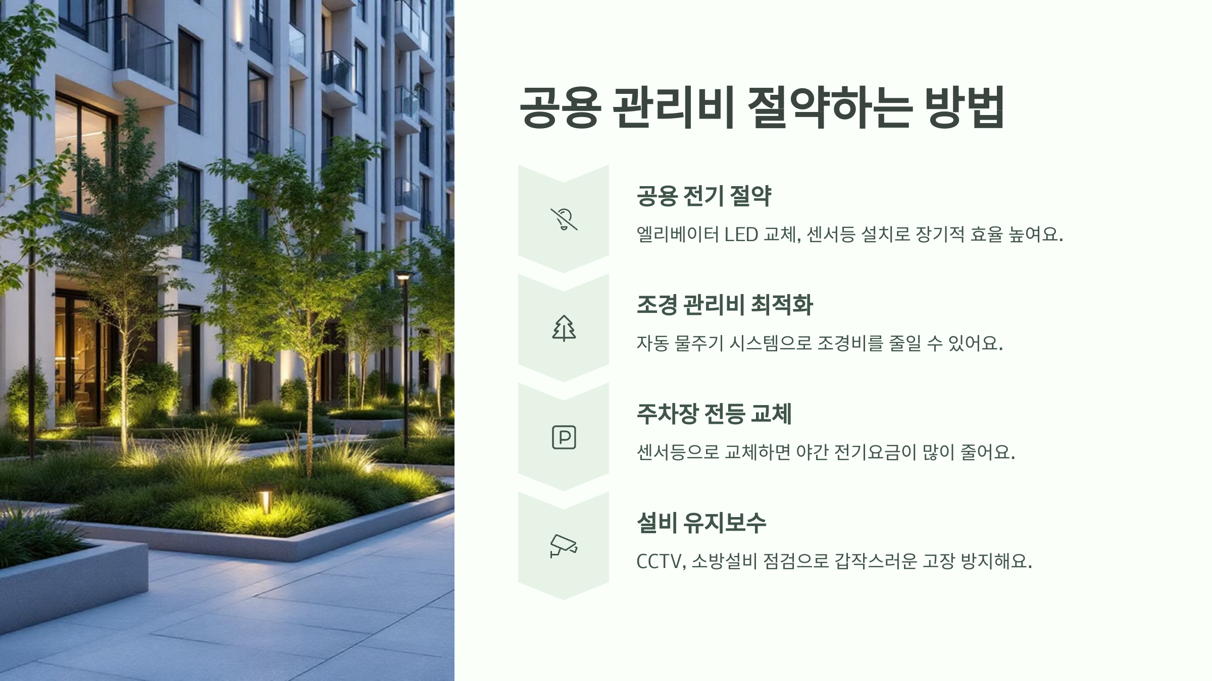 공동주택에 거주할 경우, 공용 관리비는 입주민 전체의 노력으로 줄일 수 있어요. 가장 큰 항목은 '공용 전기요금'과 '시설 유지비'예요. 먼저, 엘리베이터 LED 교체나 센서등 설치는 초기 비용은 들지만 장기적으로 효율이 좋아요.