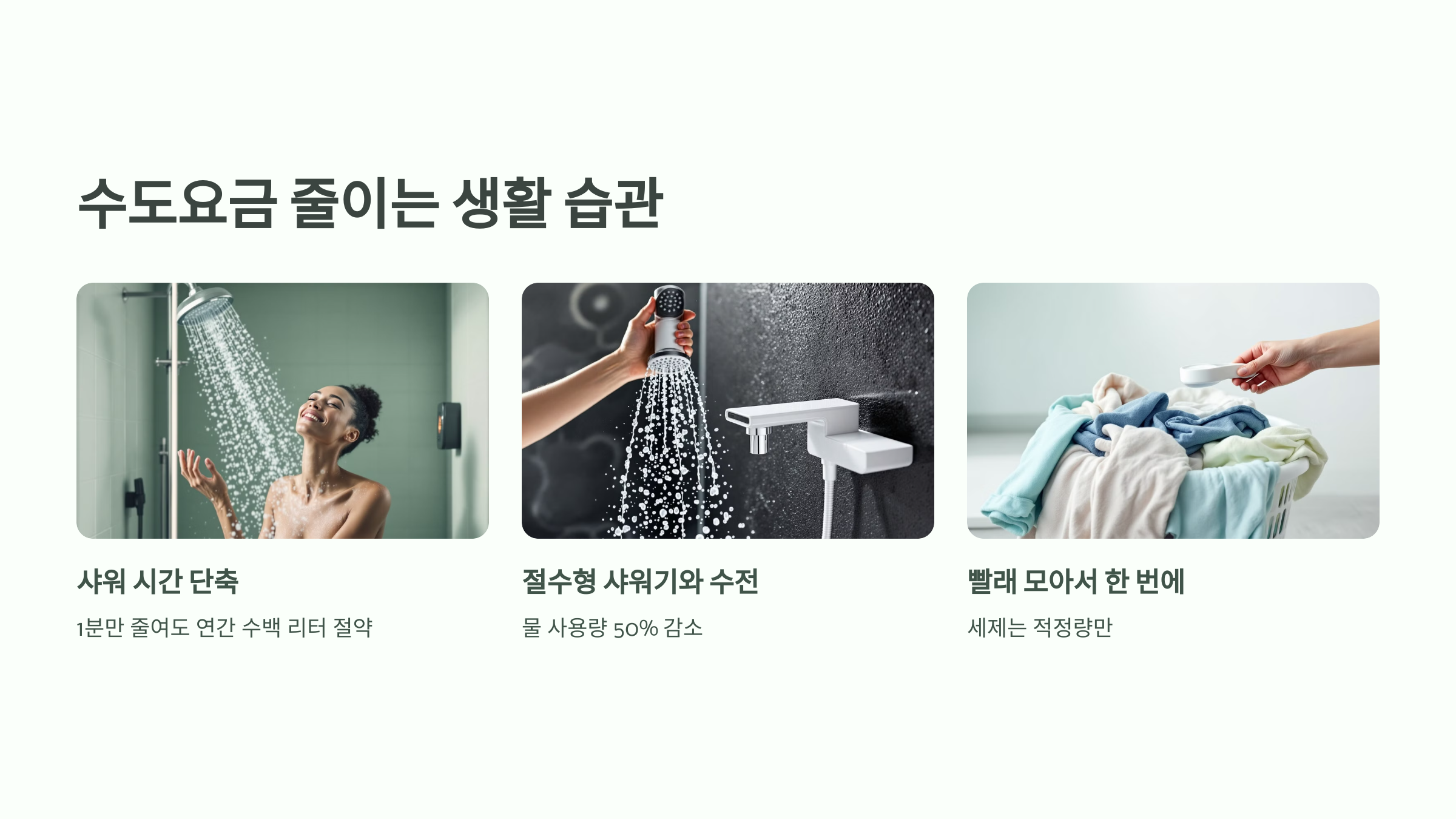 수도요금은 생각보다 절약 여지가 커요. 가장 쉽게 실천할 수 있는 건 '샤워 시간 단축'이에요. 1분만 줄여도 연간 수백 리터의 물을 아낄 수 있어요. 4인 가족이 모두 실천한다면 그 효과는 더 커지죠.