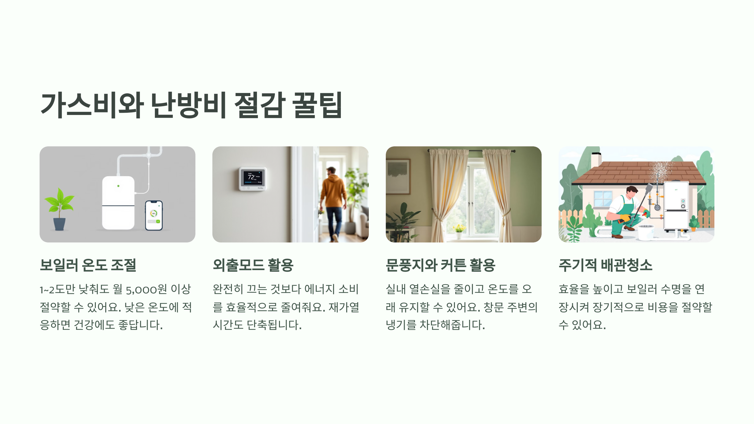 그리고 보일러는 주기적인 배관청소를 통해 효율을 높일 수 있어요. 2~3년에 한 번 정도는 전문가를 불러 청소하면 장기적으로 가스요금도 줄고, 보일러 수명도 길어져요. 관리가 절약의 시작이죠!