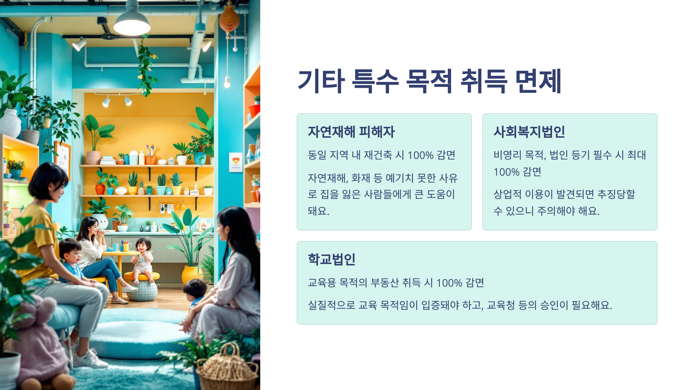 지금까지 소개한 주요 감면 대상 외에도 다양한 특수 목적에 해당될 경우 취득세를 면제받을 수 있어요. 일반적인 주택 구입뿐 아니라, 공익적 성격이나 특정한 법적 요건을 갖춘 경우도 포함된답니다.