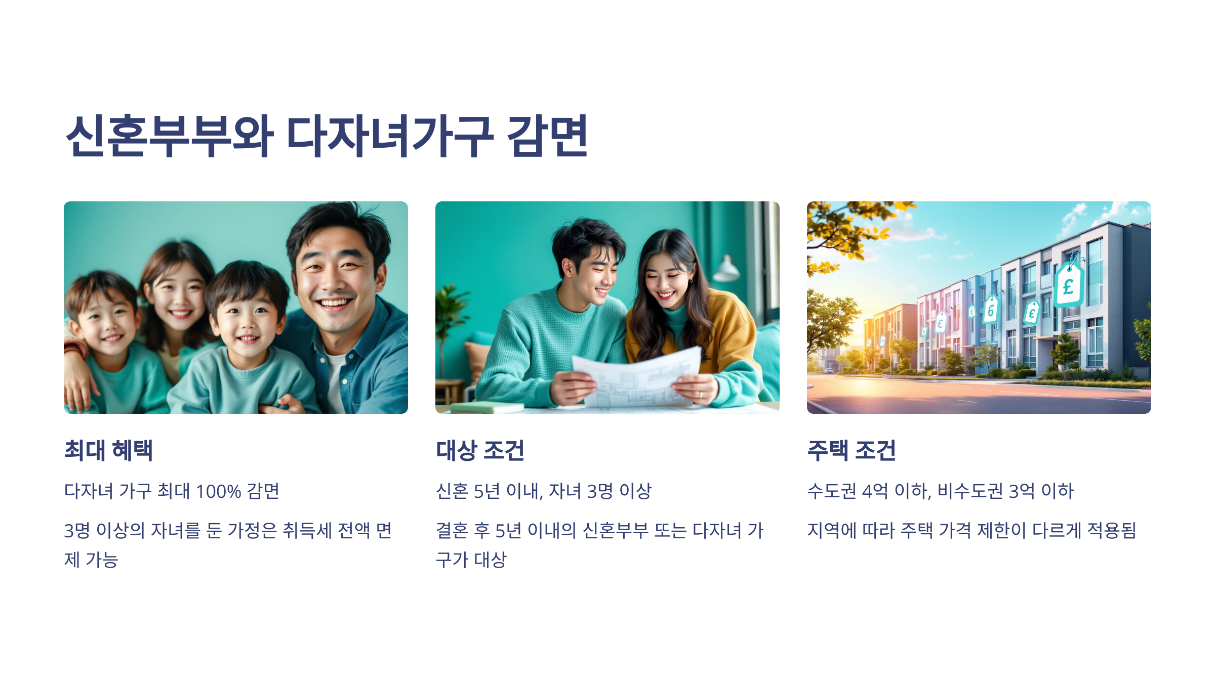 신혼부부와 다자녀 가구에게도 취득세 감면 혜택이 주어지고 있어요. 정부가 저출산 문제를 해결하고 안정적인 주거환경을 지원하기 위해 시행 중인 제도랍니다.